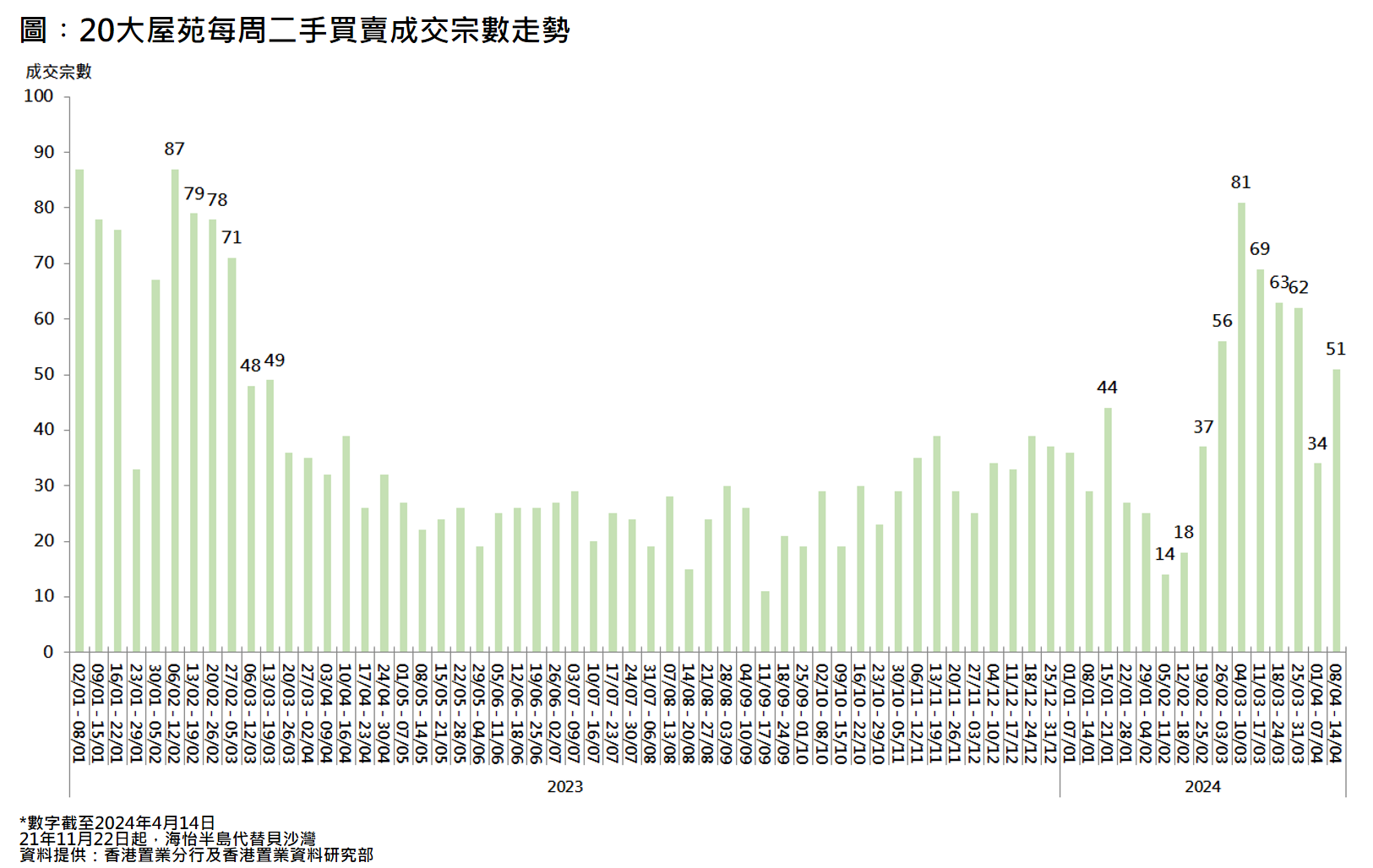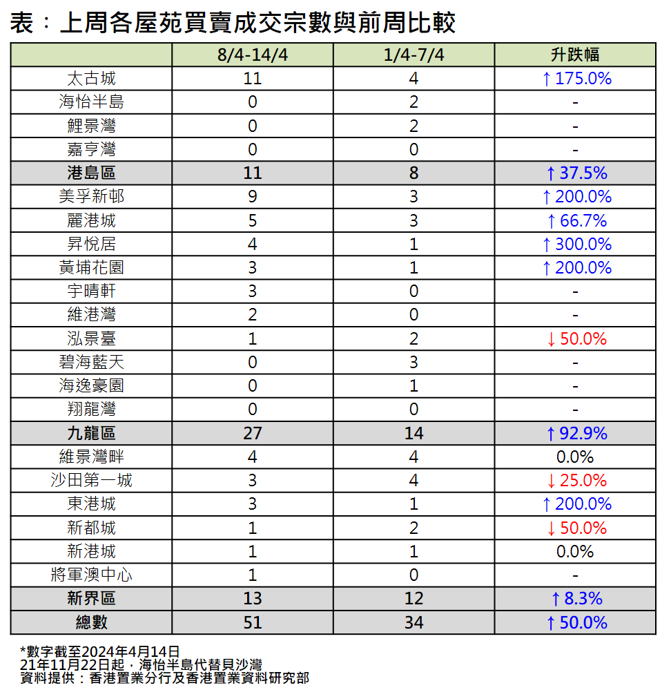 前线分行所录得的数字显示,综合过去一星期(4月8日至4月14日)全港20大主要屋苑二手买卖录51宗成交,较前周(4月1日至4月7日)的34宗回升约5成(见图)。
