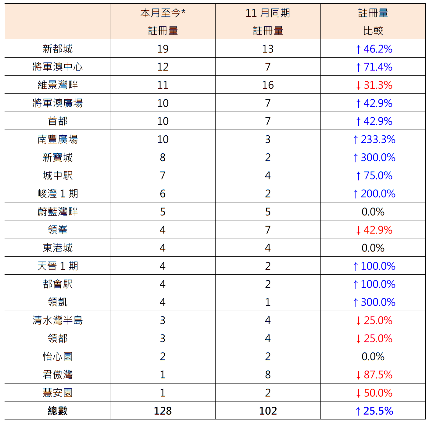 表:本月至今*将军澳区20个私人屋苑二手住宅注册量与11月同期比较