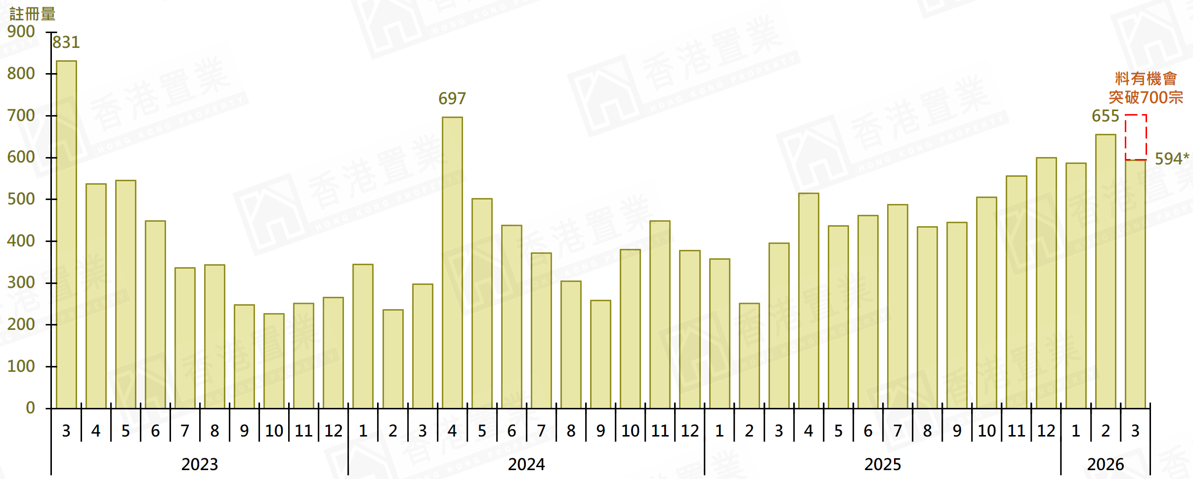 鉴于签署买卖合约至递交到土地注册处注册登记需时,每月注册个案一般主要反映前一个月市况