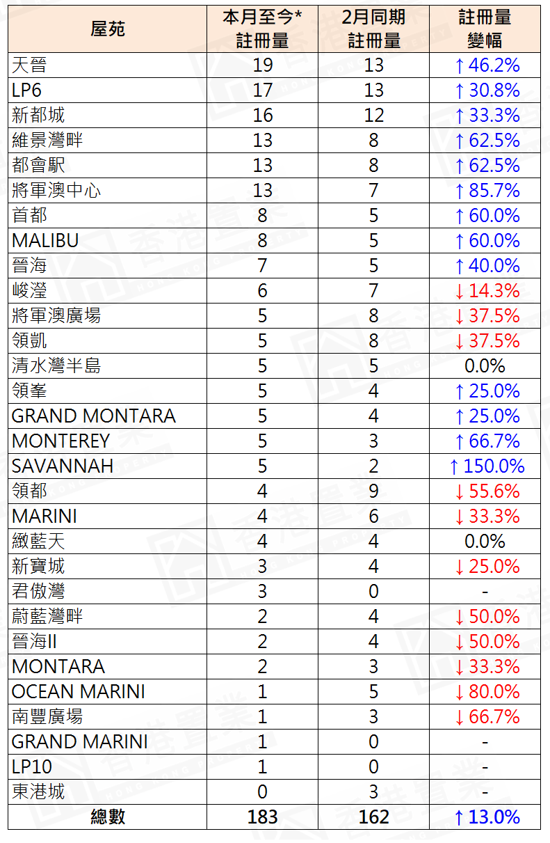若以三区划分2月住宅物业(包括一手私宅,二手私宅及二手公营房屋)注册量按月表现,当中新界区录3,790宗注册,三区中最多,较1月的2,774宗增加约36.6%,三区表现最突出,主要受位于西沙的SIERRA SEA注册个案带动,期内屋苑录1,206宗注册,较1月的98宗大增约11.3倍,单一项目已直逼同期港岛区住宅物业注册量;港岛区录1,259宗住宅物业注册,较1月的1,085宗增加约16%;相反,九龙区住宅物业录1,988宗注册,较1月的2,278宗则减少约12.7%(表)。