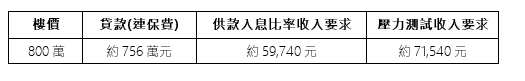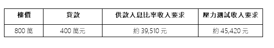 以800万物业,会由最多9成按揭,下降至最多只能有5成按揭,首期由80万元,增加至400万元,供款入息比率收入要求由不多于5成下降至4至,压力测试要求要6成下降至5成。