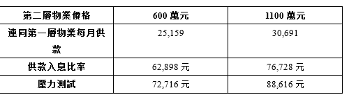 买家要注意的是,别以为银行只会以第二层物业的按揭供款计算出收入要求。以600万物业为例,由于按揭成数最多为5成,首期需要300万元。假设按揭利息为2.5厘,还款期30年计算,每月供额约11,853元,供款入息比率不高于4成下,收入要求最少为29,633元,而压力测试测试下则为34,067元。