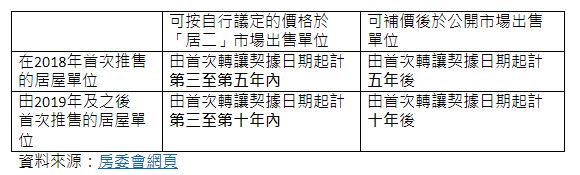 | 第三年至第五年 | 先补地价给房委会才能出售或转让。 或 无补价下以自由定价出售予白居二申请者。 | 不接受补地价程序。 无补价下以自由定价出售予白居二申请者。 | |