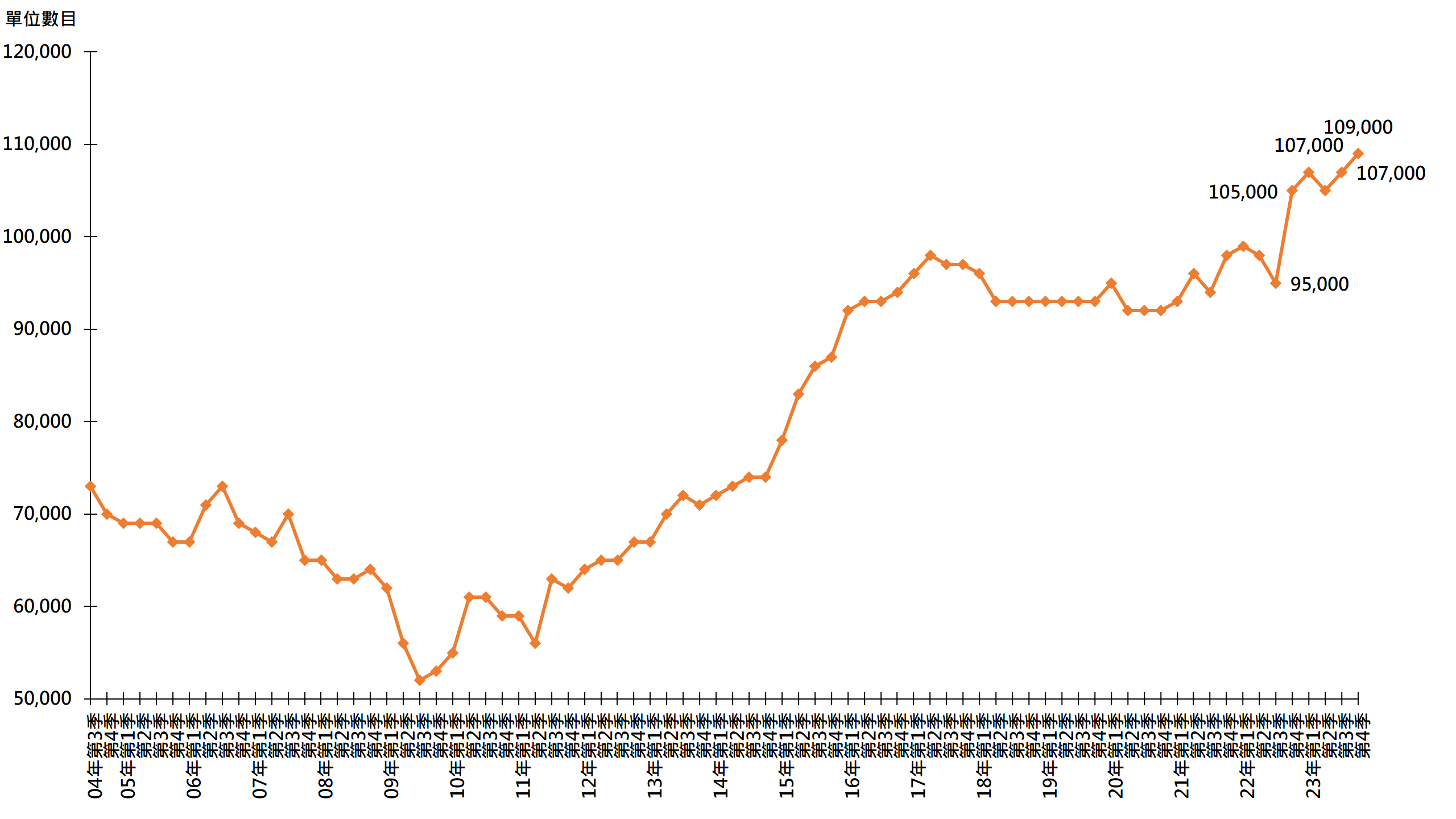 根据房屋局今日最新公布的“私人住宅一手市场供应统计数字”显示,未来三至四年潜在新供应单位数目(包括已批出土地可随时动工项目的单位数目、建筑中未售出单位数目及已落成未售出单位数目)2023年第4季录约109,000伙,较第3季约107,000伙增加约1.9%,创自2004年第3季有纪录以来的季度新高(见图)。