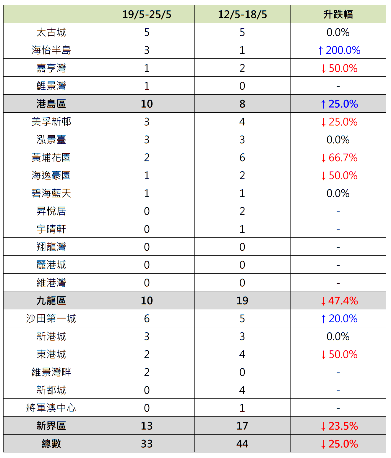 有大型新盘1个月内进行6轮销售,当中价单推售单位均沽清,带动楼市气氛;惟二手减价盘减少,上周二手交投回软;据本行前线分行所录得的数字显示,综合过去一星期(5月19日至5月25日)全港20大主要屋苑二手买卖录33宗成交,较前周(5月12日至5月18日)的44宗减少25%(见图)。