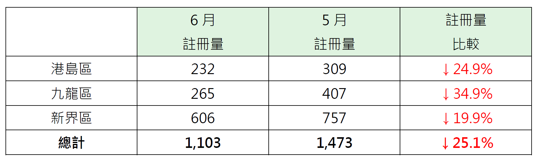以港岛、九龙及新界三区划分6月逾500万至1,000万元二手住宅注册量表现,其中新界区录606宗注册,较5月的757宗减少约19.9%;港岛区录232宗注册,较5月的309宗减少约24.9%;九龙区录265宗注册,较5月的407宗减少约34.9%(见表)。