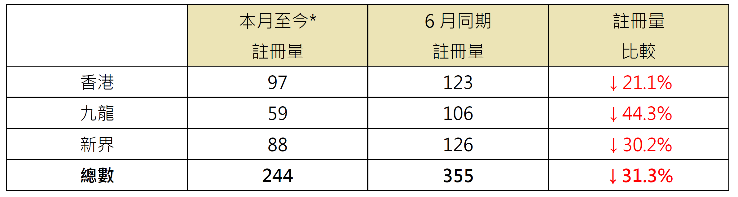 鉴于签署买卖合约至递交到土地注册处注册登记需时,7月注册个案一般主要反映6月市况;7月初政府放宽自住物业最高按揭成数及按揭保险计划,中大额自住物业尤其受惠,相信有利该类物业交投,料相关情况将会于较后月份反映。
