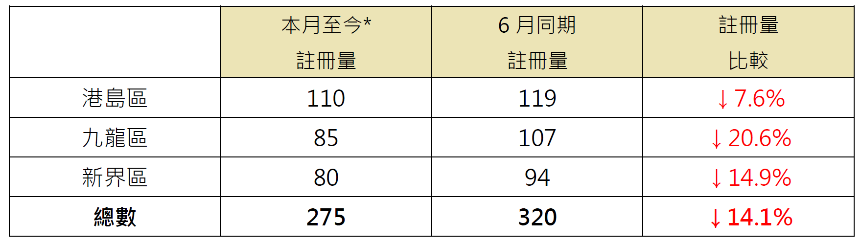 据土地注册处资料显示,本月至今(截至23日)二手住宅录2,518宗注册,较上月同期的2,502宗微增约0.6%;当中逾1,000万元二手住宅本月至今录275宗注册,较上月同期的320宗减少约14.1%,按月同期表现差过大市;若以目前注册进度推算,料全月录不足400宗,惟相信仍较今年首季平均每月约293宗高约3成(见图)。鉴于签署买卖合约至递交到土地注册处注册登记需时,7月注册个案一般主要反映6月市况。