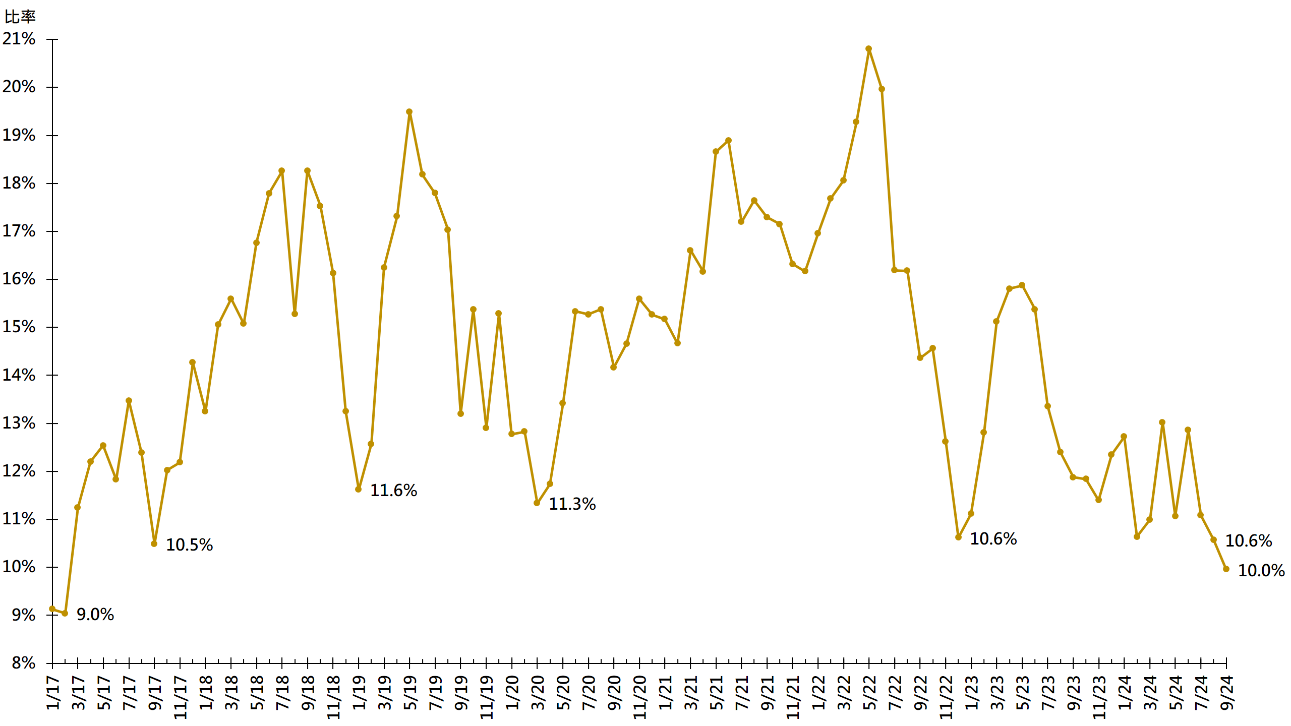 逾1,000万元二手住宅注册量占整体二手住宅注册量比率,亦因而由8月约10.6%,减少约0.6个百分点,至9月约10%,连跌3个月,创逾7年半新低(见图)。