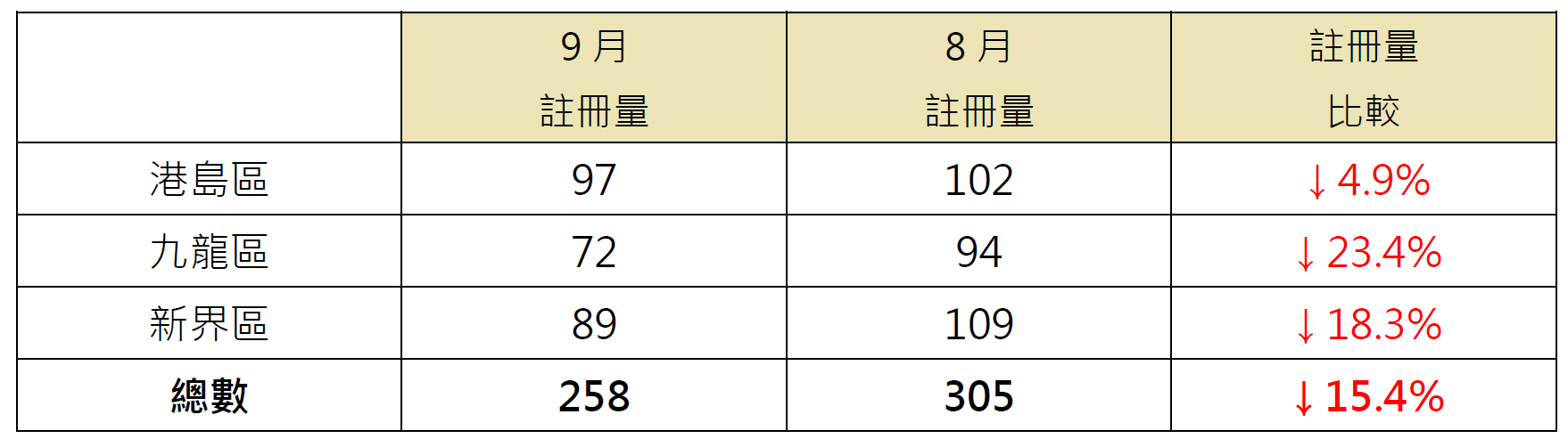 据土地注册处资料显示,9月二手住宅(包括二手私人住宅及二手公营房屋)录2,591宗注册,较8月的2,885宗减少约10.2%;当中逾1,000万元二手住宅9月录258宗注册,较8月的305宗减少约15.4%,按月表现差过大市。鉴于签署买卖合约至递交到土地注册处注册登记需时,9月注册个案一般主要反映8月市况。