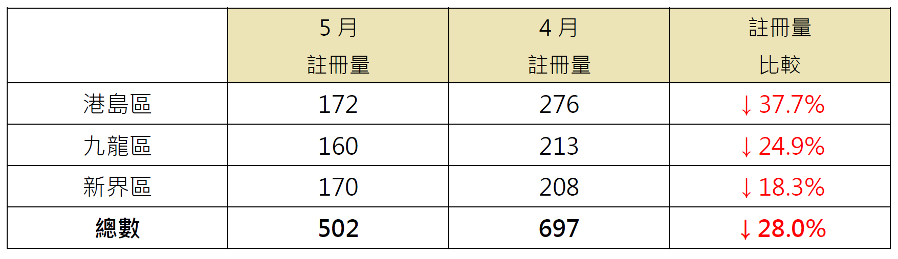 若以港岛、九龙及新界三区划分5月逾1,000万元二手住宅注册量表现,当中新界区录170宗注册,较4月的208宗减少约18.3%;九龙区录160宗注册,较4月的213宗减少约24.9%;港岛区录172宗注册,较4月的276宗减少约37.7%(见表)。