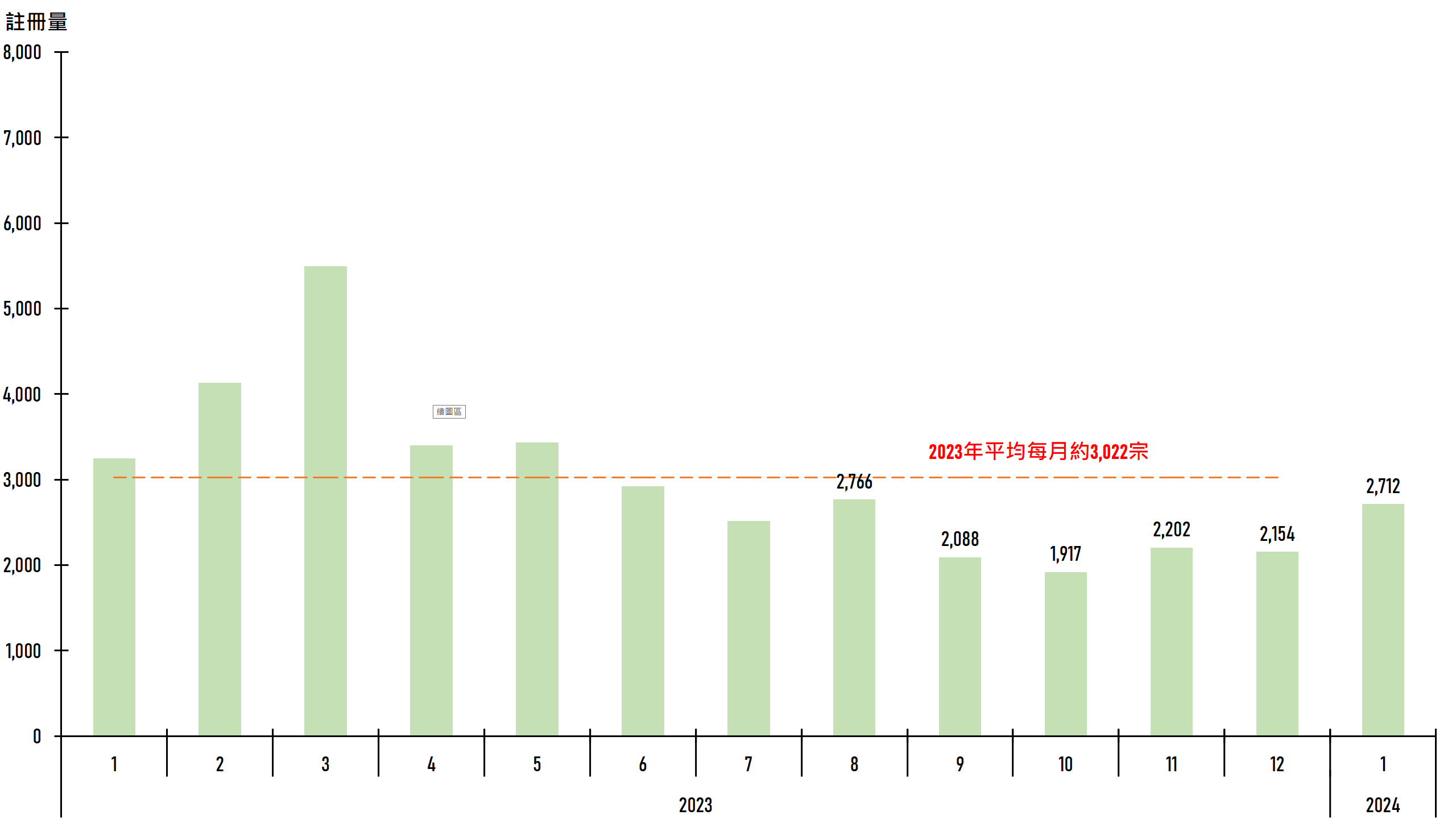 据土地注册处资料显示,1月二手住宅(包括二手私人住宅及二手公营房屋)录2,712宗注册,较去年12月的2,154宗增加约25.9%,创5个月新高,惟较去年平均每月约3,022宗仍低约1成(见图)。鉴于签署买卖合约至递交到土地注册处注册登记需时,2024年1月注册个案一般主要反映2023年12月市况。
