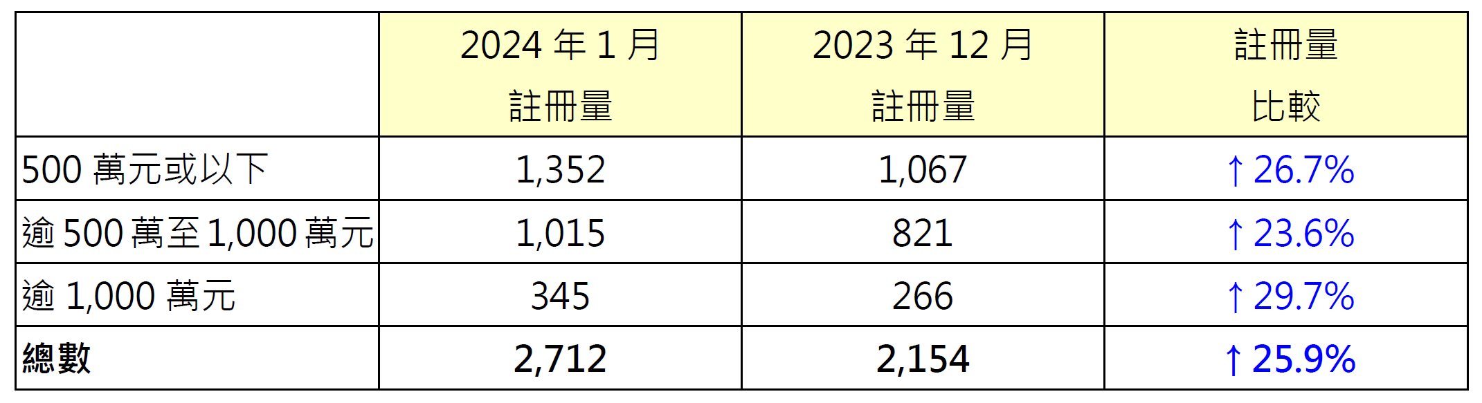 若以金额划分二手住宅注册量按月表现,当中逾1,000万元二手住宅录345宗注册,较去年12月的266宗增加约29.7%;500万元或以下二手住宅录1,352宗注册,较去年12月的1,067宗增加约26.7%;逾500万至1,000万元二手住宅录1,015宗注册,较去年12月的821宗增加约23.6%(见表)。
