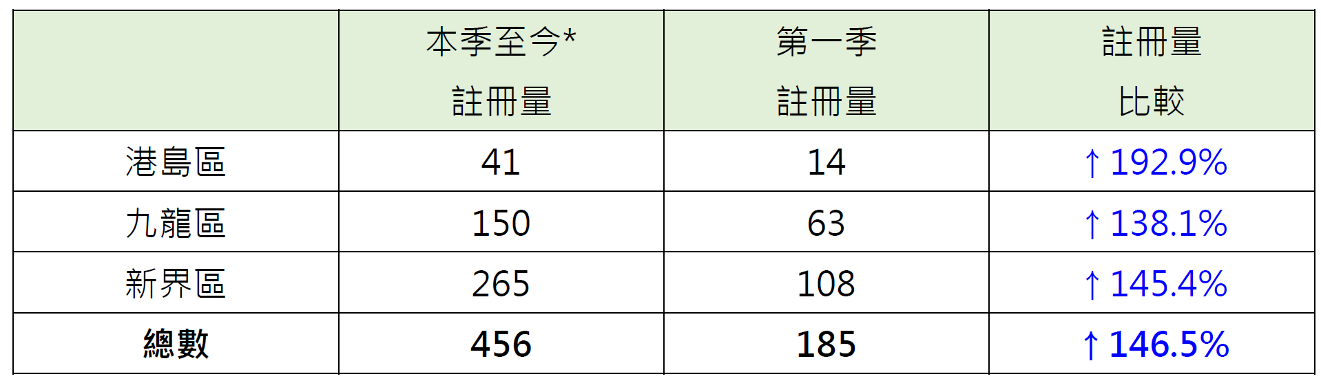 若以三区划分本季至今二手公屋注册量表现,其中九龙区录150宗注册,较首季的63宗增加近1.4倍;新界区录265宗注册,较首季的108宗增加逾1.4倍;港岛区录41宗注册,较首季的14宗增加逾1.9倍(见表)。
