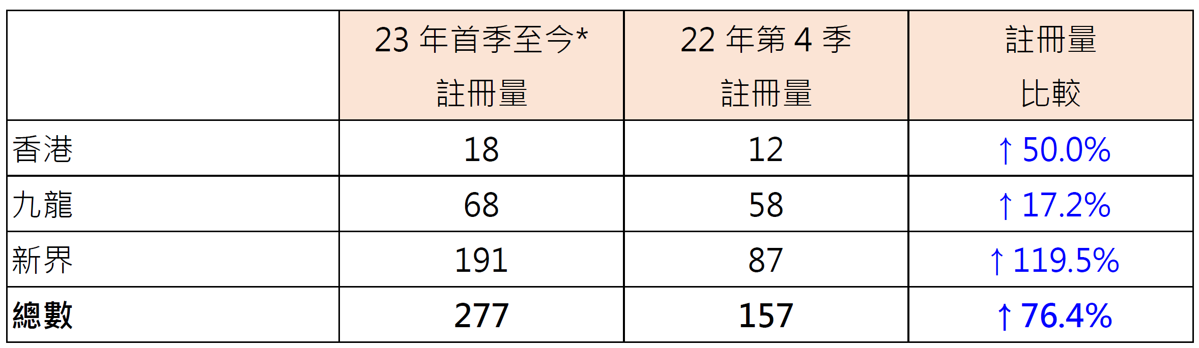 若按地区划分港岛、九龙及新界三区首季至今二手公屋注册量表现,其中新界区录191宗注册,较去年第4季增加近1.2倍;港岛区录18宗注册,较上季的12宗增加50%;九龙区录68宗注册,较上季的58宗增加约17.2%(见表)。