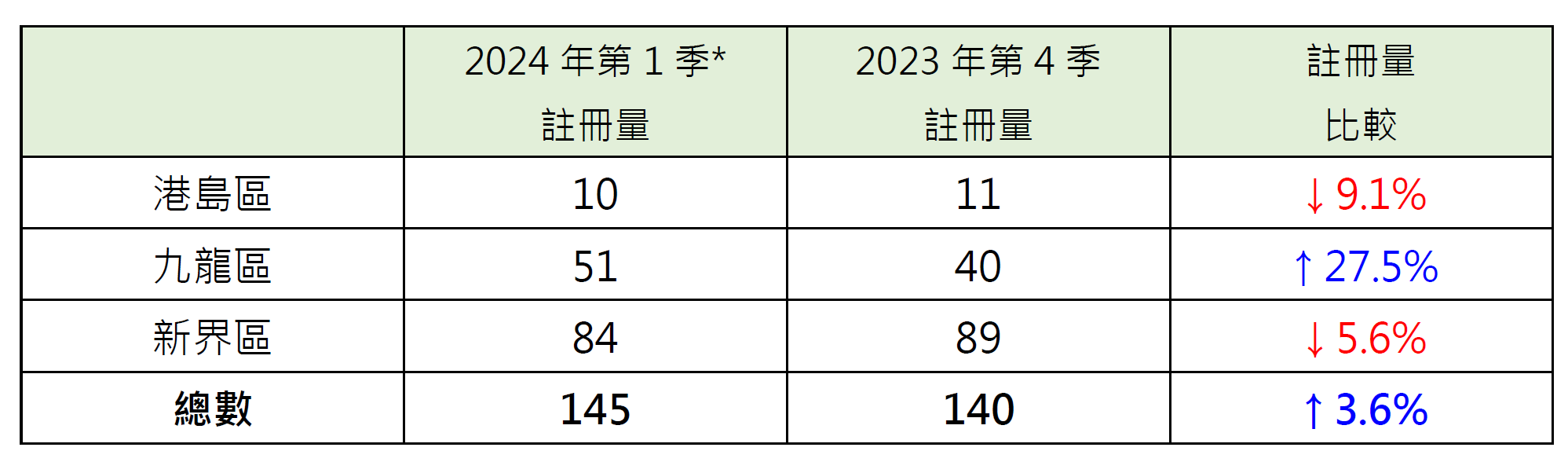 若以三区划分首季至今二手公屋注册量表现,其中九龙区录51宗注册,已超上季全季的40宗约27.5%,带动全港首季至今二手公屋注册量按季录升;相反,新界区录84宗注册,仍较上季全季的89宗低约5.6%;港岛区录10宗注册,仍较上季全季的11宗低约9.1%(见表)。
