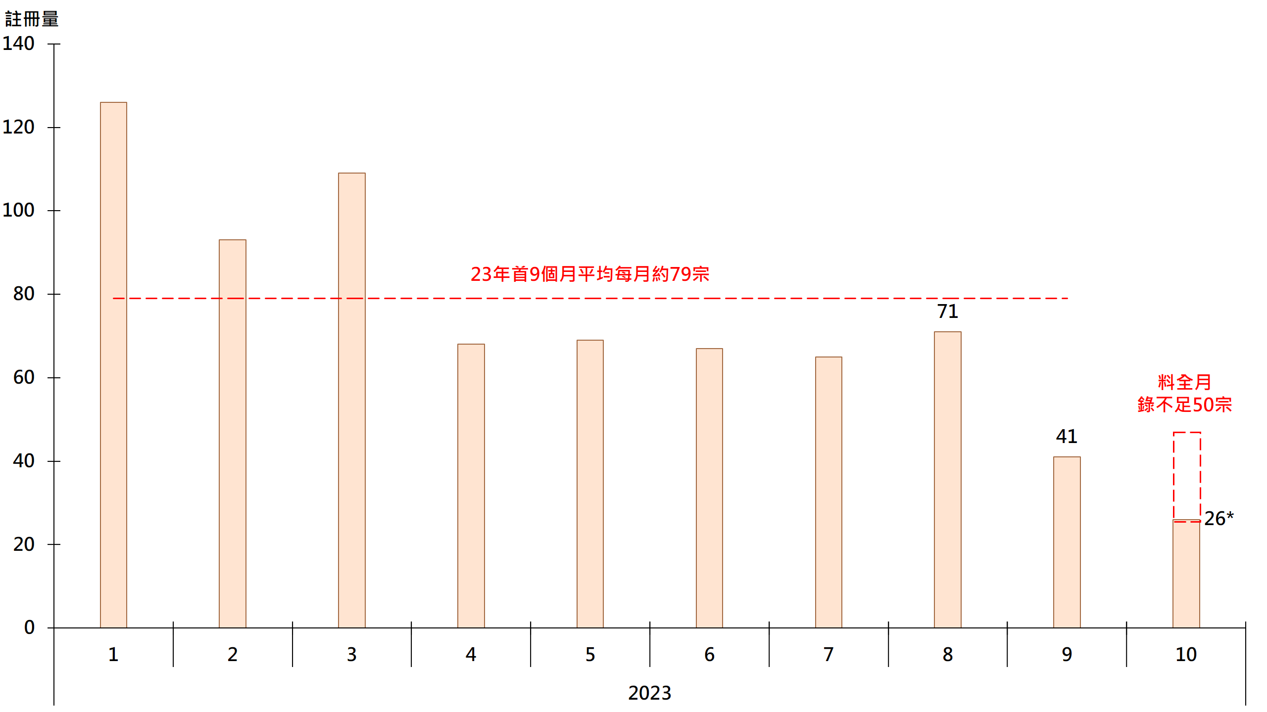 据土地注册处资料显示,本月至今(截至17日)录26宗二手公屋(包括已补地价的自由市场及未补地价的第二市场)注册,较上月同期的19宗增加约36.8%。注册量按月同期升幅显著,主要因“基数低”所致。事实上,若以目前注册进度推算,料10月全月录不足50宗,明显低于今年首9个月平均每月约79宗水平(见图)。鉴于签署买卖合约至递交到土地注册处注册登记需时,10月注册个案一般主要反映9月市况。