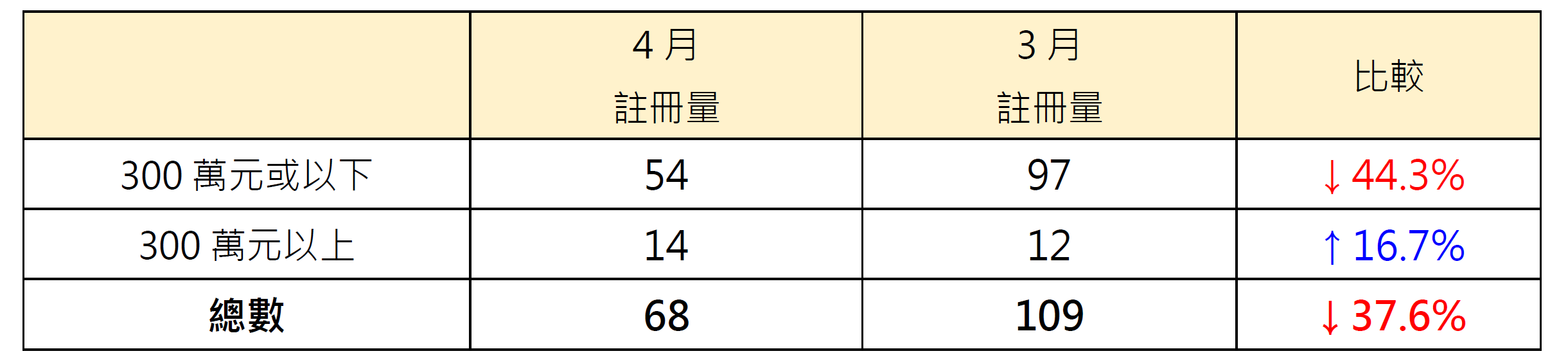 表一:以金额划分4月二手公屋注册量与3月比较