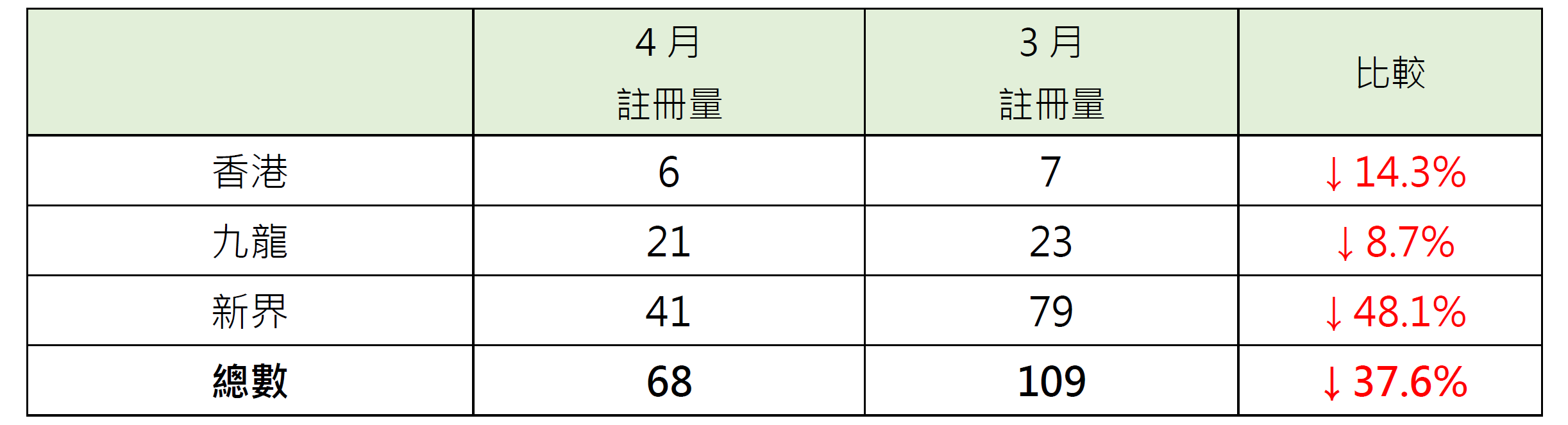 若以港岛、九龙及新界三区划分4月二手公屋注册量表现,当中九龙区录21宗注册,较3月的23宗减少约8.7%;港岛区录6宗注册,较3月的7宗减少约14.3%;新界区录41宗注册,较3月的79宗减少约48.1%(见表二)。