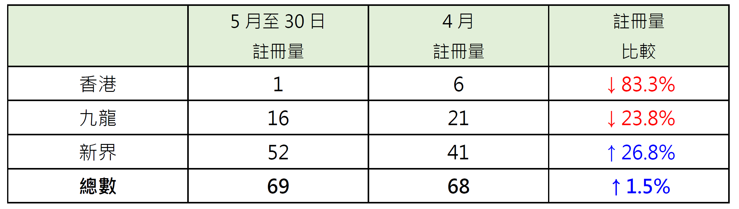 若以港岛、九龙及新界三区划分本月至今(截至30日)二手公屋注册量表现,当中新界区录52宗注册,较4月的41宗增加约26.8%;相反,九龙区录16宗注册,较4月的21宗减少约23.8%;港岛区录1宗注册,较4月的6宗减少约83.3%(见表)。