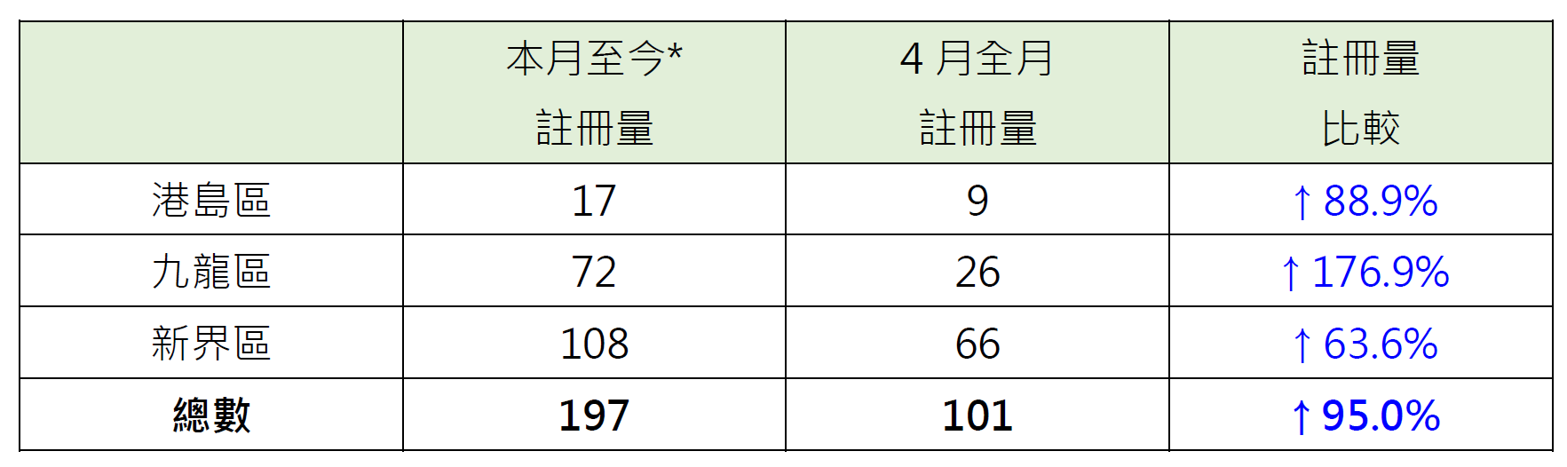 若以三区划分本月至今二手公屋注册量表现,其中九龙区录72宗注册,已超4月全月的26宗逾1.7倍;港岛区录17宗注册,已超4月全月的9宗约88.9%;新界区录108宗注册,已超4月全月的66宗约63.6%(见表)。