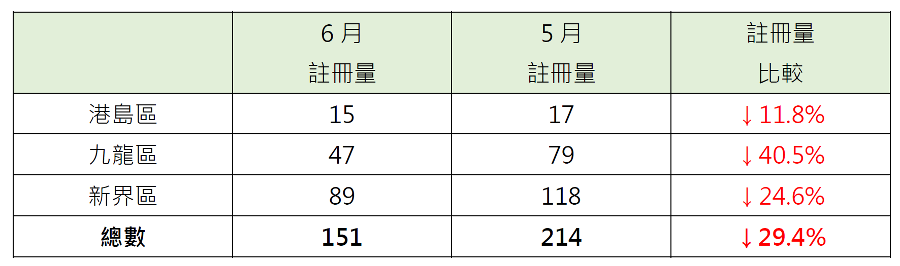 若以三区划分6月二手公屋注册量表现,其中港岛区录15宗注册,较5月的17宗减少约11.8%;新界区录89宗注册,较5月的118宗减少约24.6%;九龙区录47宗注册,较5月的79宗减少约40.5%(见表)。