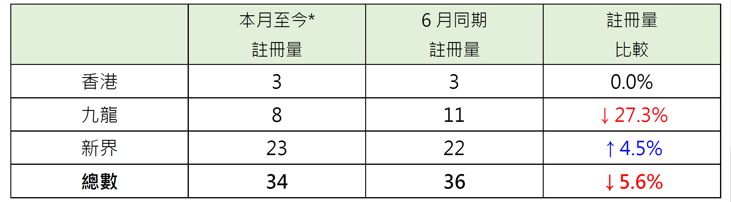 若以港岛、九龙及新界三区划分本月至今二手公屋注册量表现,当中九龙区录8宗注册,较6月同期的11宗减少约27.3%;港岛区录3宗注册,按月同期持平;而新界区录23宗注册,较6月同期的22宗增加约4.5%(见表)。