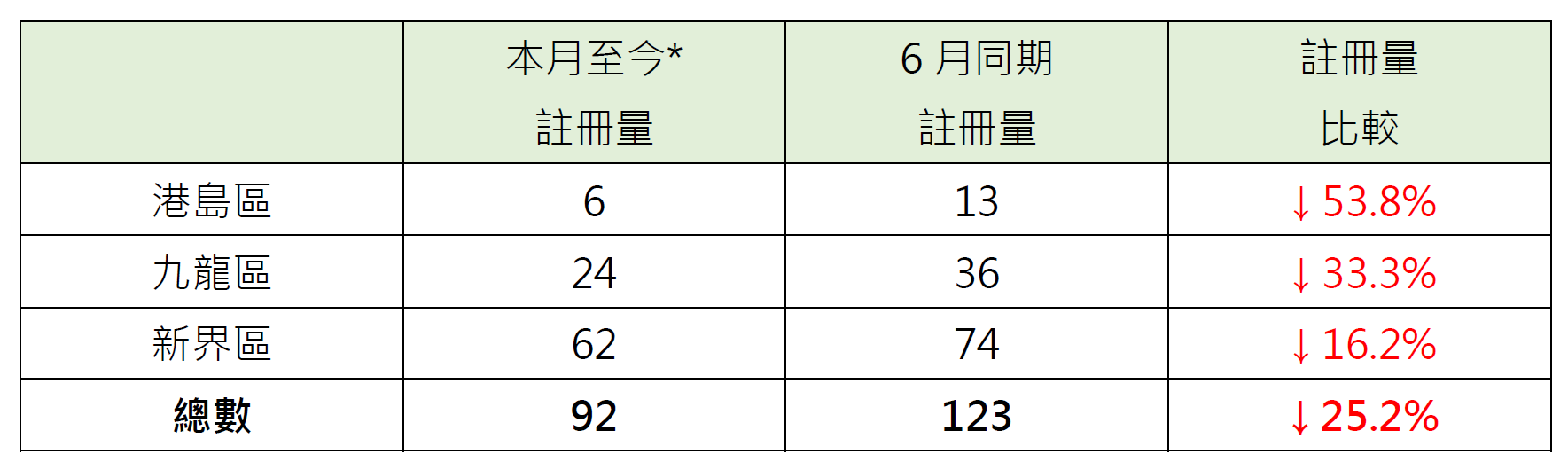 鉴于签署买卖合约至递交到土地注册处注册登记需时,每月注册个案一般主要反映前一个月市况
