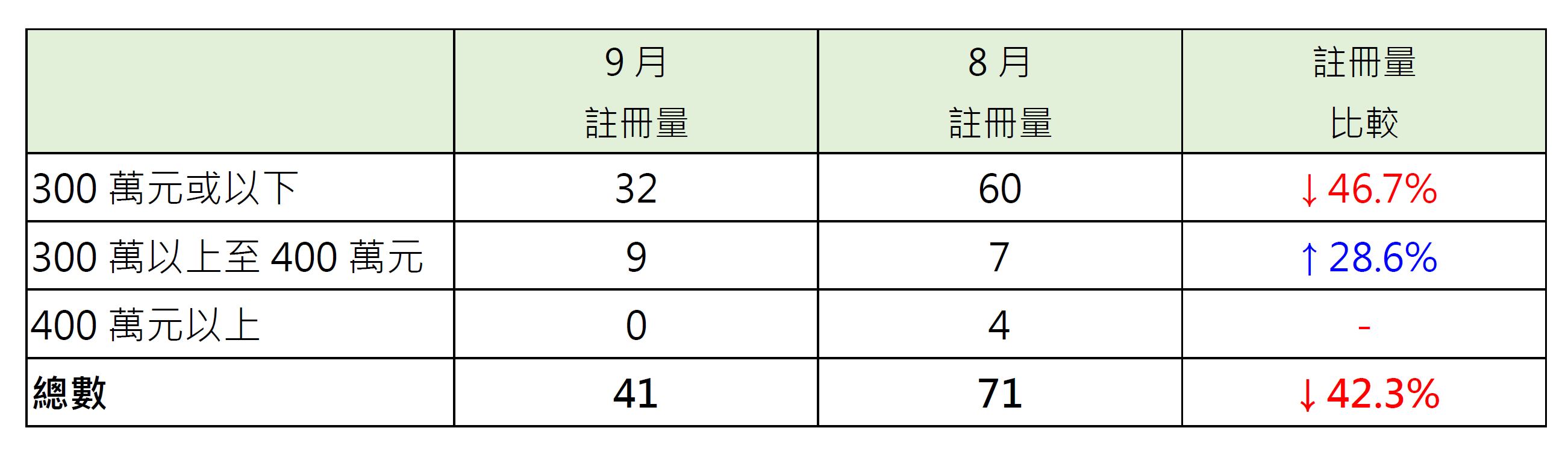 若以金额划分9月二手公屋注册量表现,当中300万元或以下二手公屋录32宗注册,较8月的60宗减少约46.7%;逾400万元二手公屋为“零登记”,均拖低9月整体二手公屋注册量按月显著回落;当中只有300万以上至400万元二手公屋注册量按月上升,9月录9宗,较8月微增2宗(见表)。
