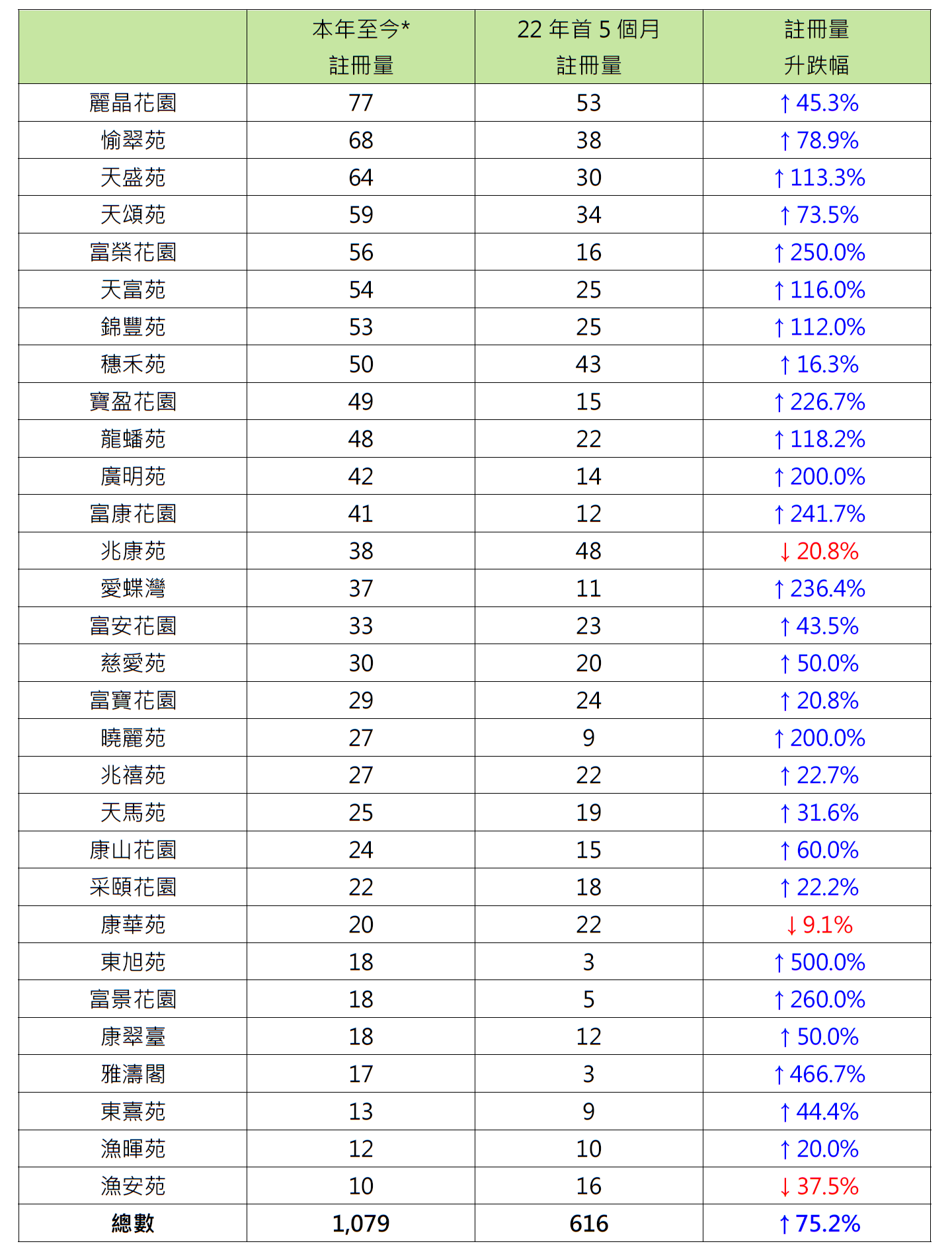 而以选取的30个居屋屋苑中,二手居屋注册量屋苑本年至今排名方面,九龙湾丽晶花园以77宗注册居榜首,已超去年首5个月的53宗约45.3%;沙田愉翠苑以68宗注册排第二,已超去年首5个月的38宗约78.9%;天水围天盛苑以64宗注册排第三,已超去年首5个月的30宗逾1.1倍(见表)。