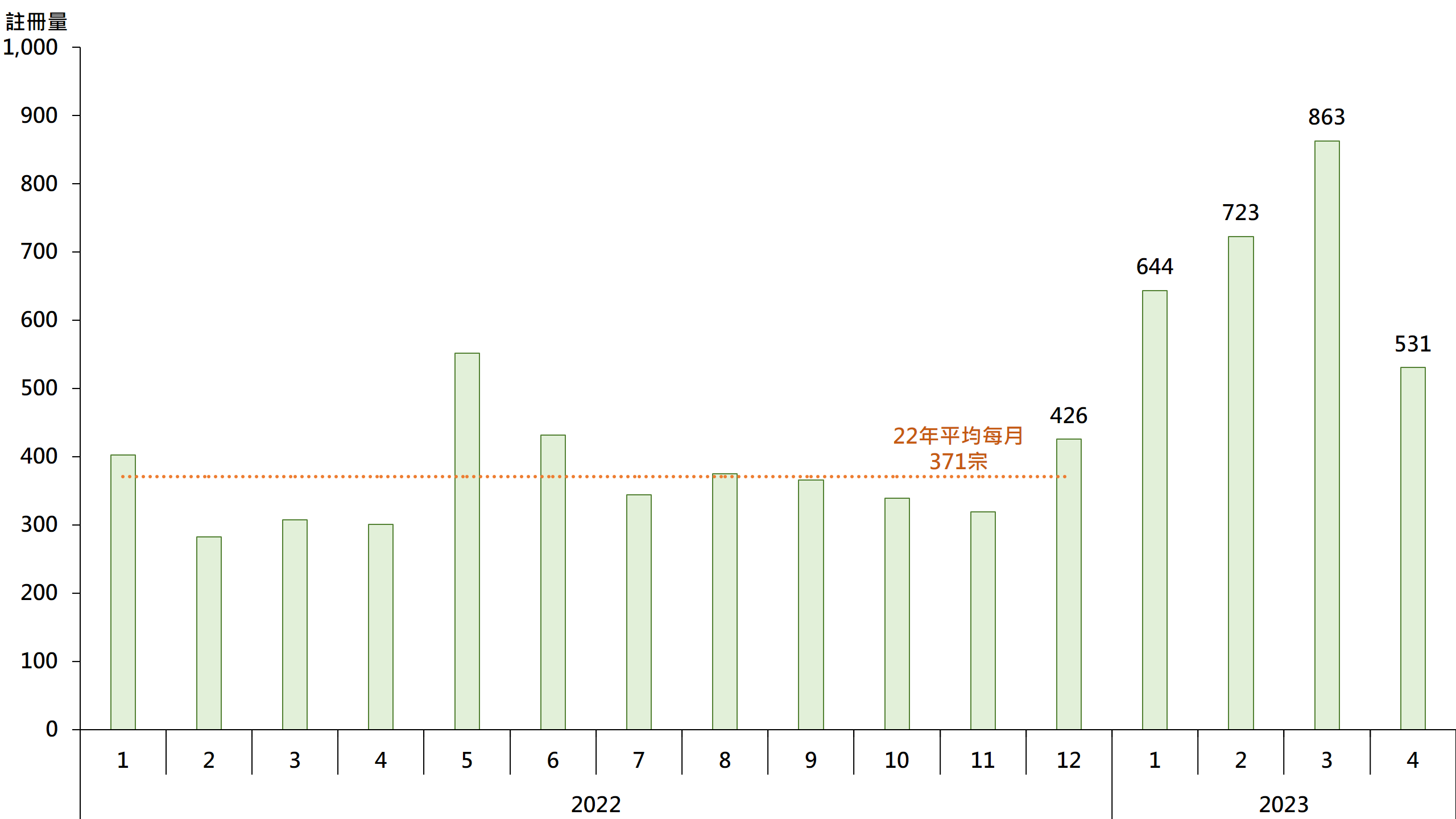 据土地注册处资料显示,二手居屋(包括已补地价的自由市场及未补地价的第二市场)4月录531宗注册,虽较3月的863宗减少约38.5%,创4个月新低,但仍高于去年平均每月约371宗逾4成(见图),反映4月注册量仍属较高水平。鉴于签署买卖合约至递交到土地注册处注册登记需时,4月注册个案一般主要反映3月市况。