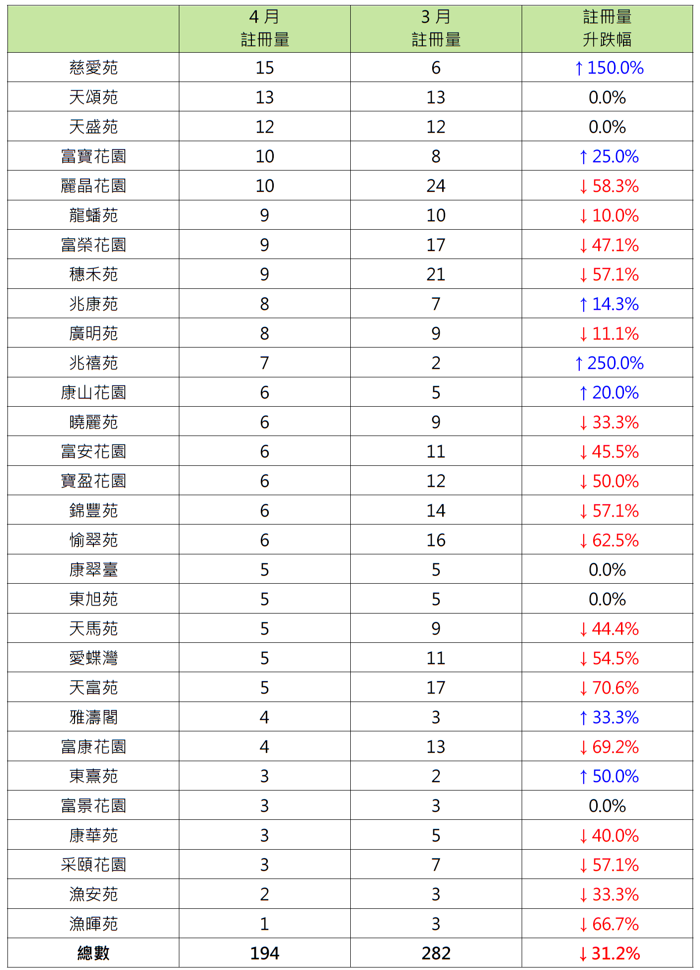 报升屋苑中,屯门兆禧苑录7宗注册,较3月的2宗增加2.5倍;慈云山慈爱苑录15宗注册,较3月的6宗增加1.5倍;筲箕湾东熹苑录3宗注册,较3月的2宗增加50%。