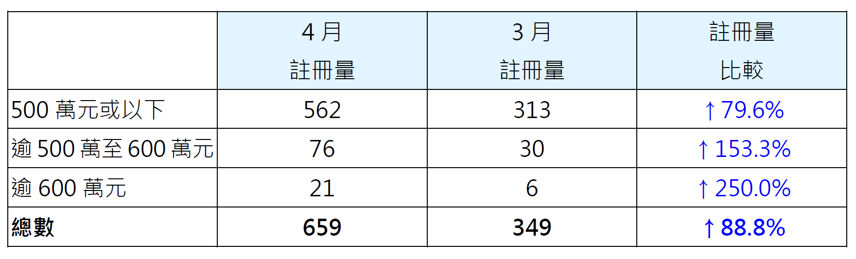 若以金额划分4月二手居屋注册量按月表现,当中逾600万元二手居屋录21宗注册,较3月的6宗增加2.5倍;逾500万至600万元二手居屋录76宗注册,较3月的30宗增加逾1.5倍;500万元或以下二手居屋录562宗注册,较3月的313宗增加约79.6%(见表)。