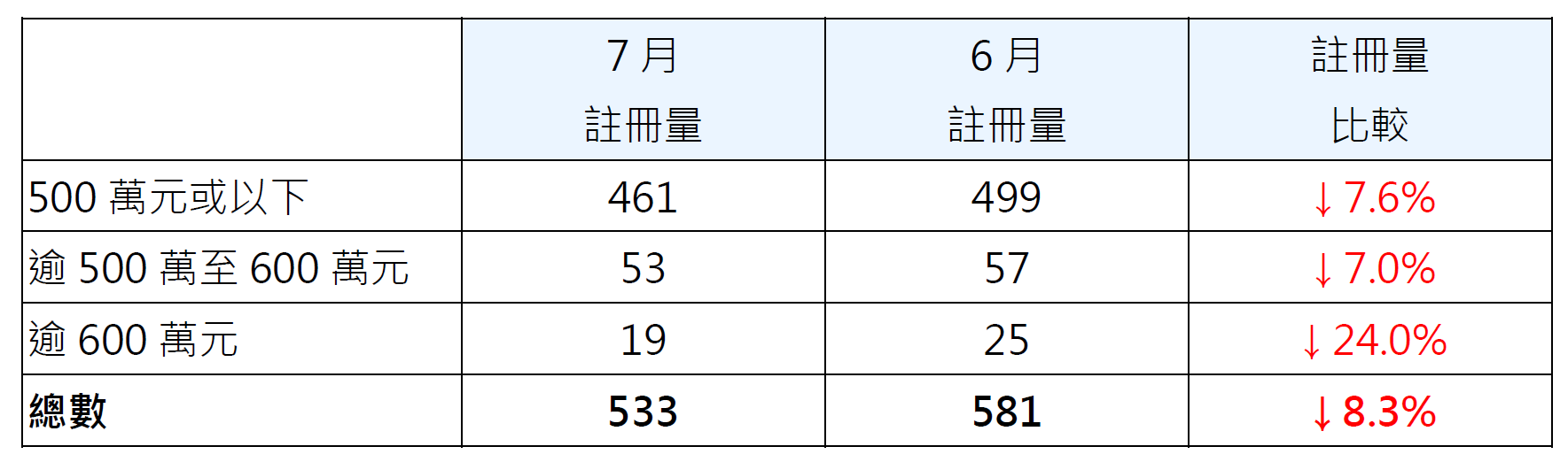 若以金额划分7月二手居屋注册量按月表现,当中逾600万元二手居屋录19宗注册,较6月的25宗减少24%;500万元或以下二手居屋录461宗注册,较6月的499宗减少约7.6%;逾500万至600万元二手居屋录53宗注册,较6月的57宗减少约7%(见表)。