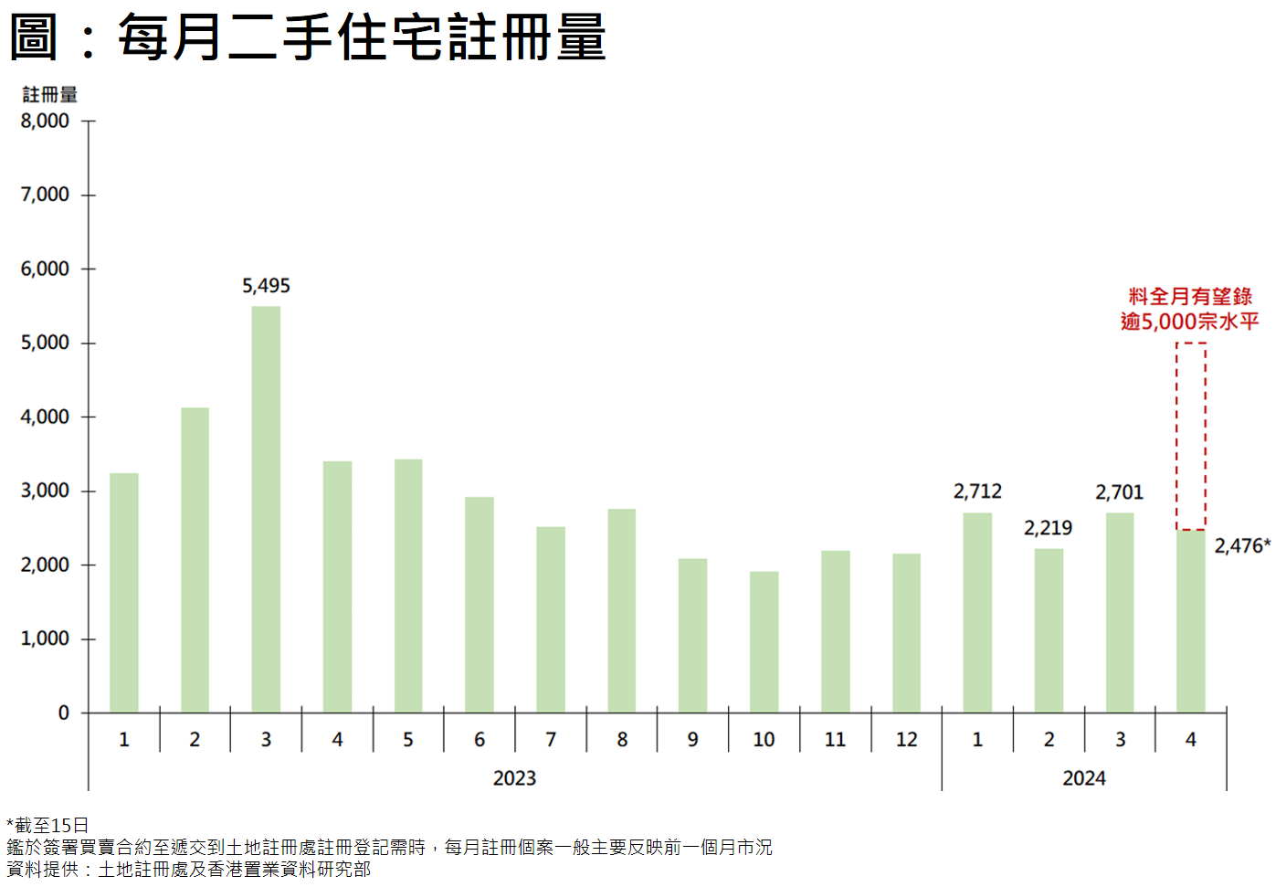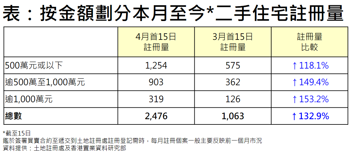 据土地注册处资料显示,本月至今(截至15日)二手住宅(包括二手私人住宅及二手公营房屋)录2,476宗注册,较上月同期的1,063宗显著增加超过1.3倍。鉴于注册量属滞后数字,撤辣后交投转趋畅旺,相信会陆续反映于4月的注册数字,若以目前注册进度推算,料全月录注册量有机会突破5,000宗水平,届时将创13个月新高(见图)。