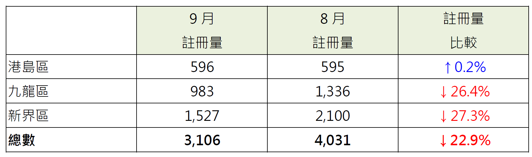 若以三区划分9月住宅物业注册量按月表现,当中九龙区住宅物业录983宗注册,较8月的1,336宗减少约26.4%;新界区住宅物业录1,527宗注册,较8月的2,100宗减少约27.3%;相反,港岛区住宅物业录596宗注册,较8月的595宗微增约0.2%(见表)。