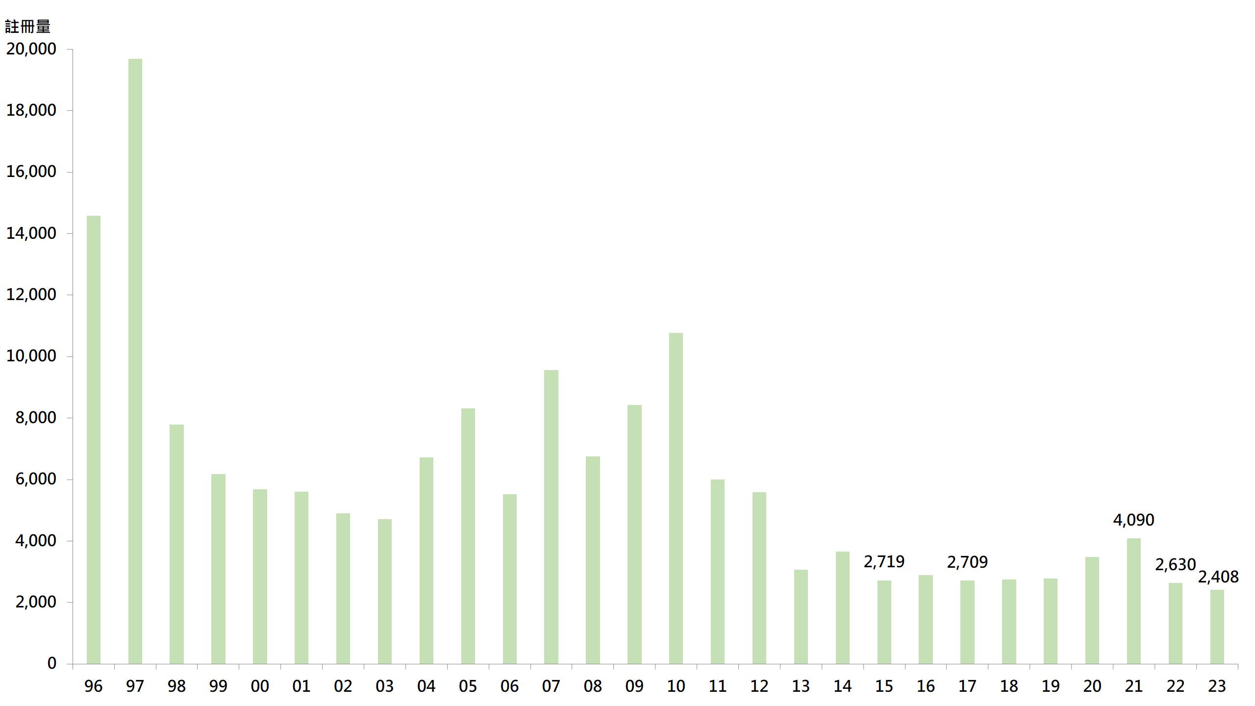 据土地注册处资料显示,二手住宅(包括二手私人住宅及二手公营房屋)2023年录36,268宗注册,较2022年的36,974宗减少约1.9%;当中十大传统屋苑去年录2,408宗注册,较22年的2,630宗减少约8.4%,按年表现跑输大市,亦创自96年有纪录新低(见图)。