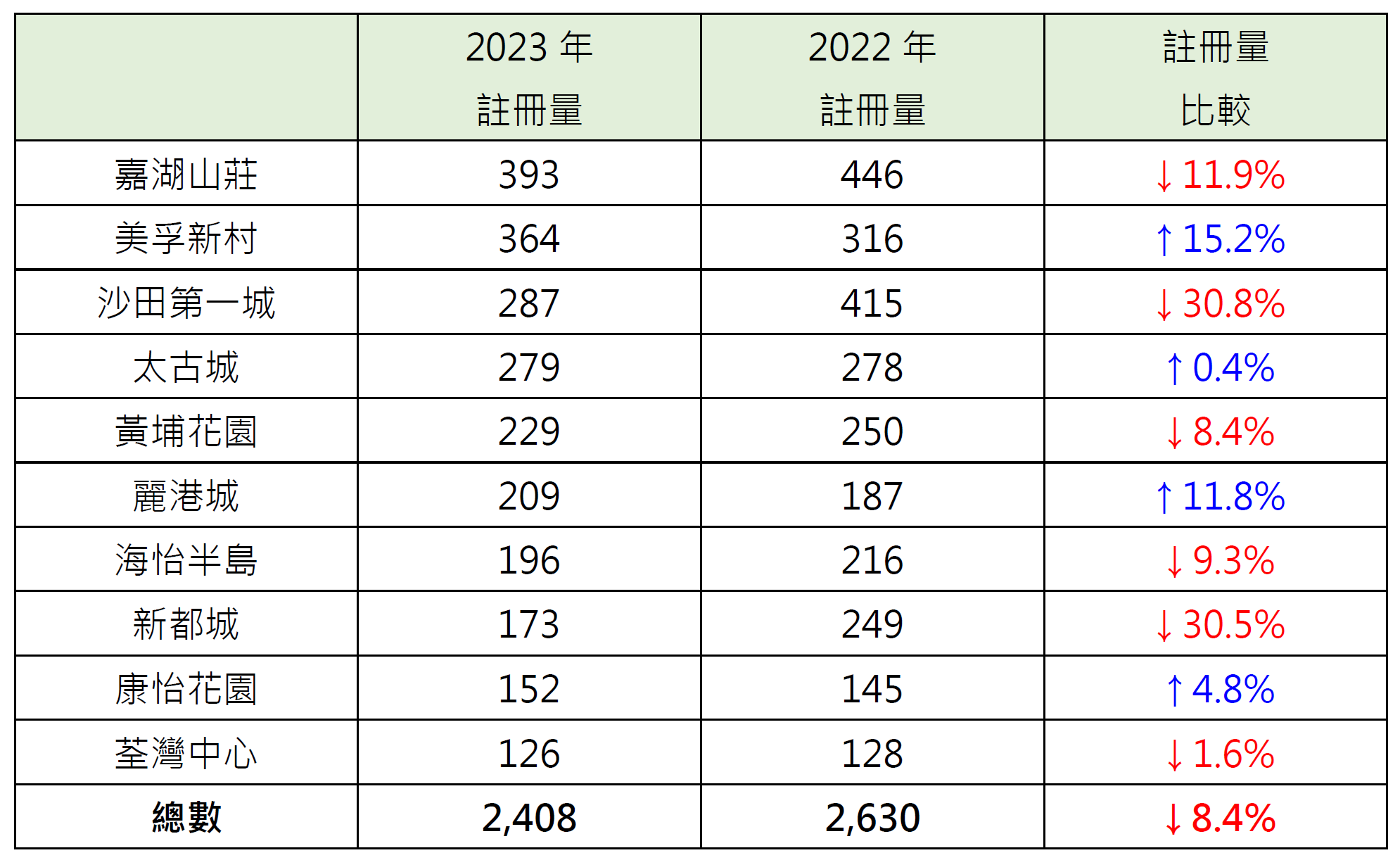 报升屋苑中,美孚新村录364宗注册,较22年的316宗增加约15.2%;丽港城录209宗注册,较22年的187宗增加约11.8%;康怡花园录152宗注册,较22年的145宗增加约4.8%。