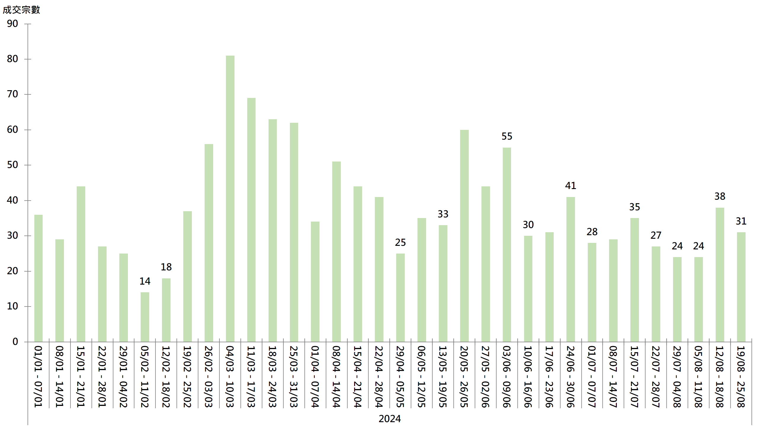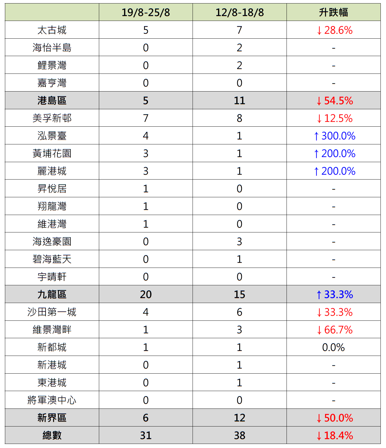 上周再有全新盘推售,抢去市场部分购买力,再加上市场预期美联储减息将至,观望情绪越趋浓厚,上周二手交投下跌;据本行前线分行所录得的数字显示,综合过去一星期(8月19日至8月25日)全港20大主要屋苑二手买卖录31宗成交,较前周(8月12日至8月18日)的38宗减少约18.4%,惟仍创5周次高(见图)。