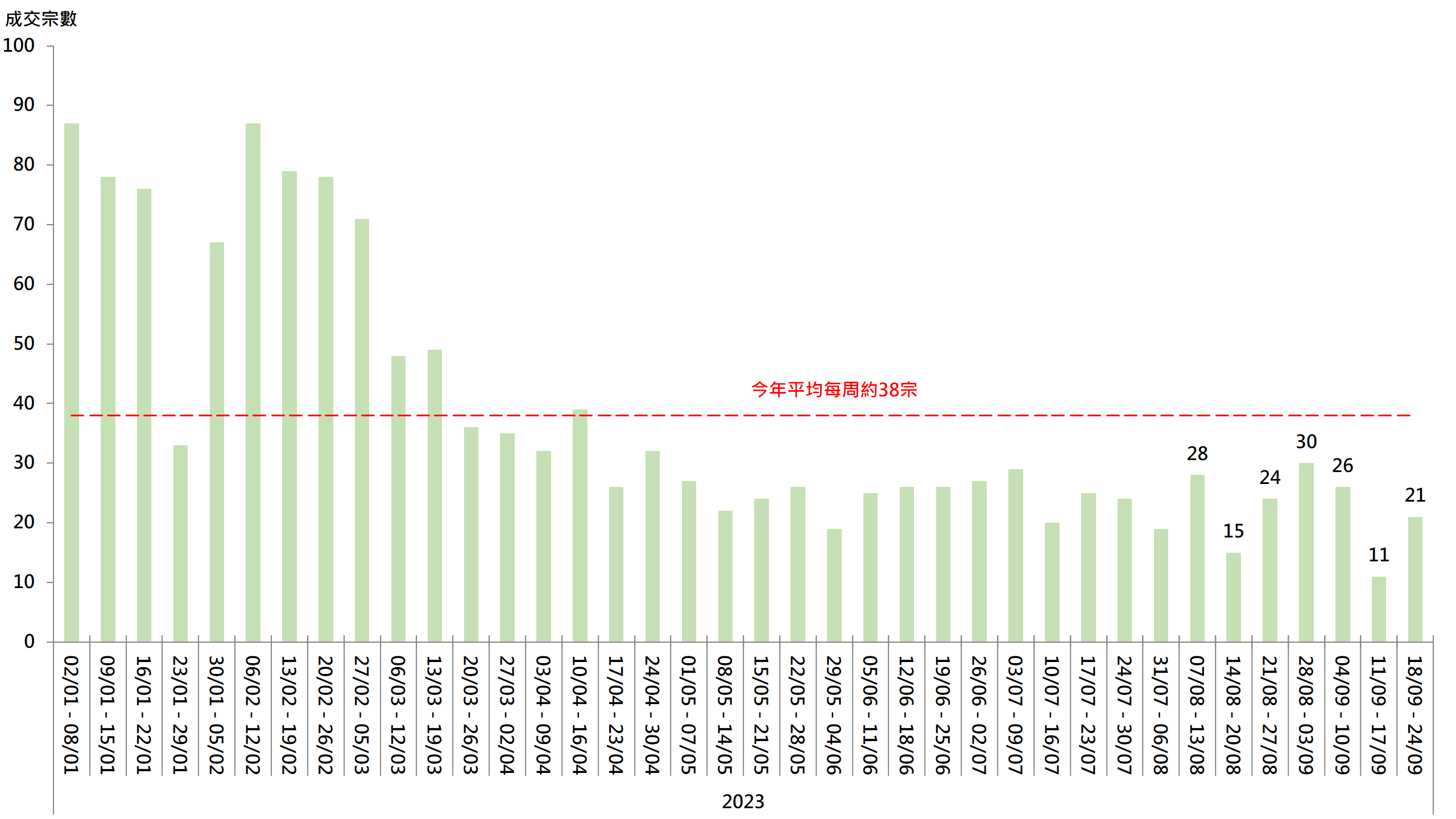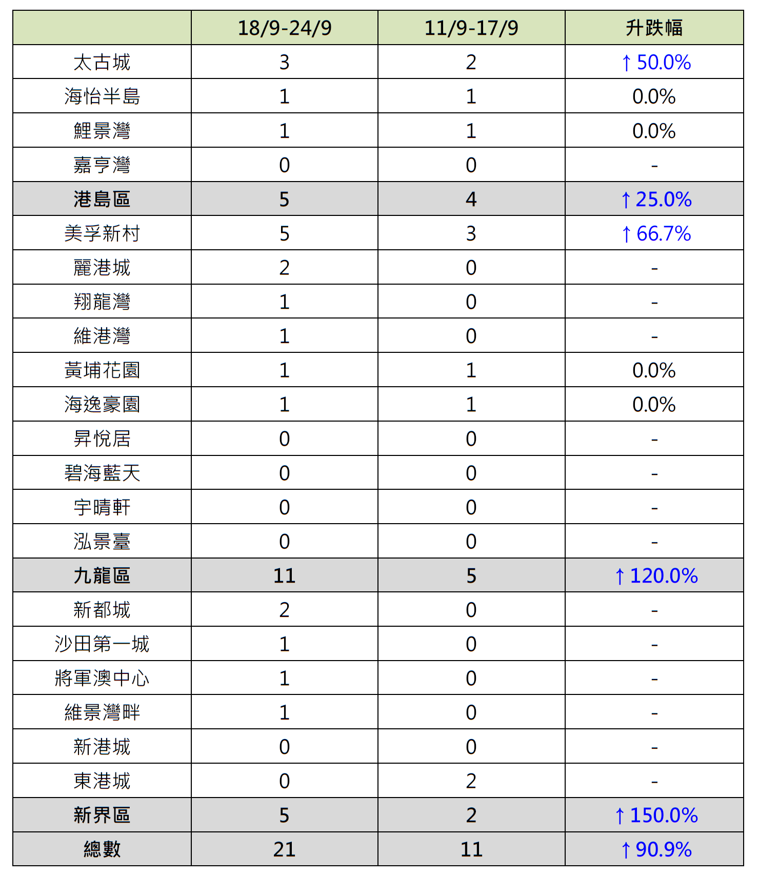 据本行前线分行所录得的数字显示,综合过去一星期(9月18日至9月24日)全港20大主要屋苑二手买卖录21宗成交,较前周(9月11日至9月17日)的11宗增加10宗;虽然成交宗数按周大增,但主要因前一周仅11宗“基数低”所致;事实上,若与今年平均每周约38宗相比,仍低近一半,反映二手交投仍于低水平徘徊(见图)。