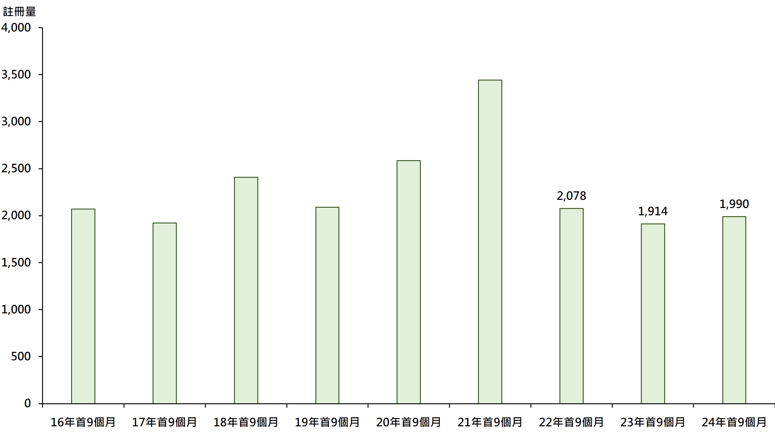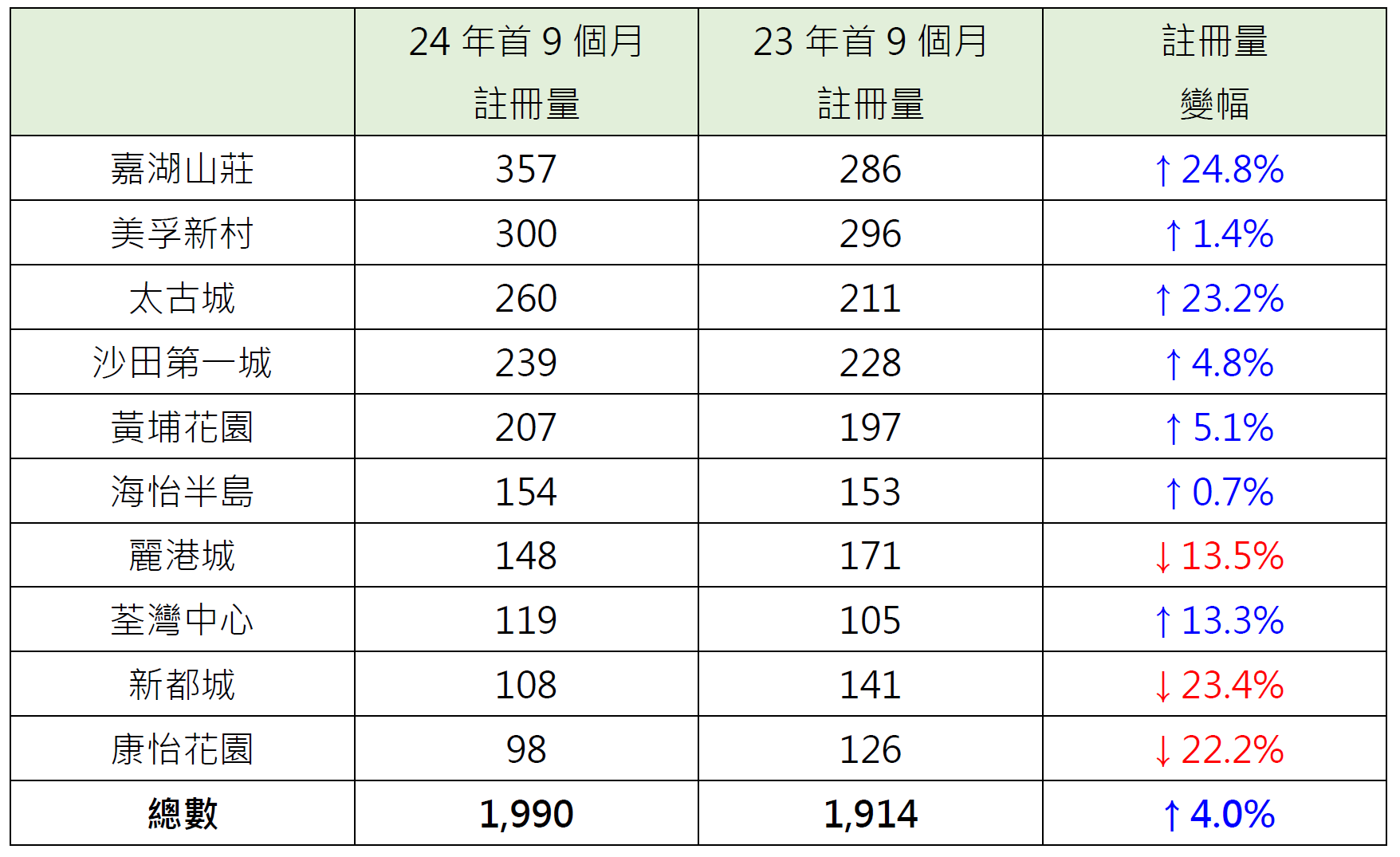 十大传统屋苑中,有7个屋苑今年首9个月注册量按年同期报升,当中嘉湖山庄录357宗注册,较去年同期的286宗增加约24.8%;太古城录260宗注册,较去年同期的211宗增加约23.2%;荃湾中心录119宗注册,较去年同期的105宗增加约13.3%。