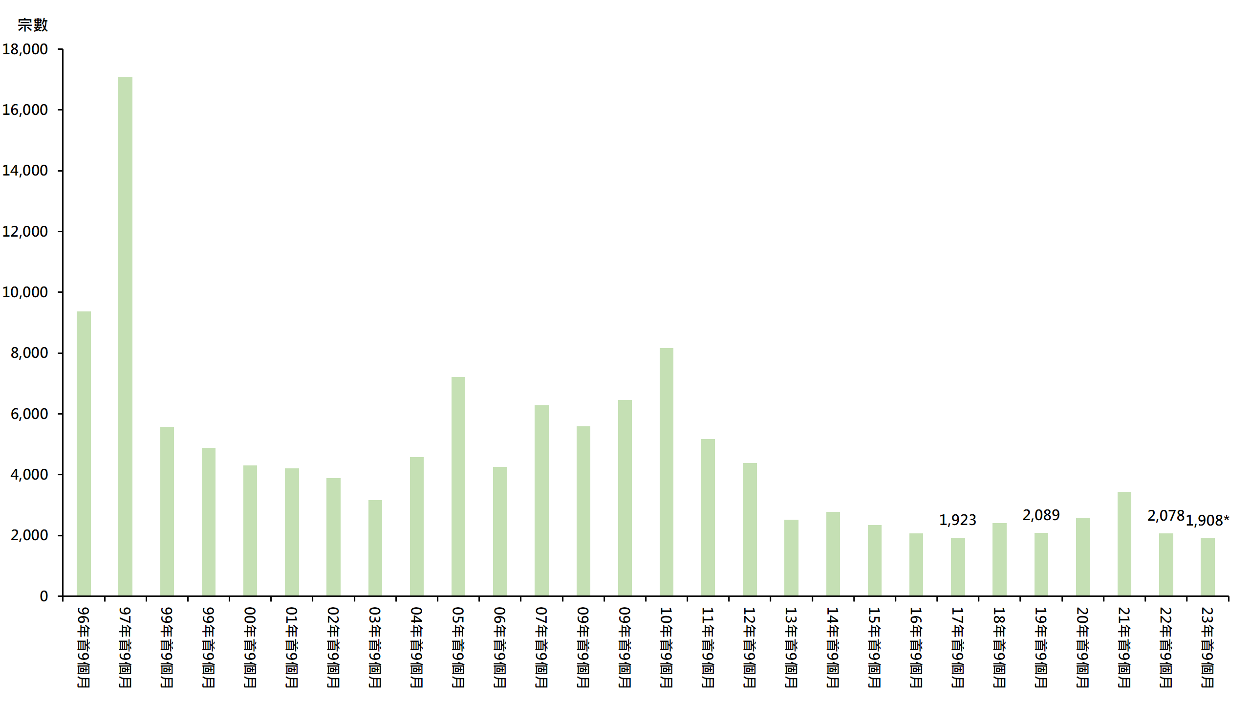据土地注册处资料显示,十大传统屋苑本年至今(截至9月28日)录1,908宗注册,较去年首9个月的2,078宗减少约8.2%,暂创自1996年有纪录以来同期新低(见图)。