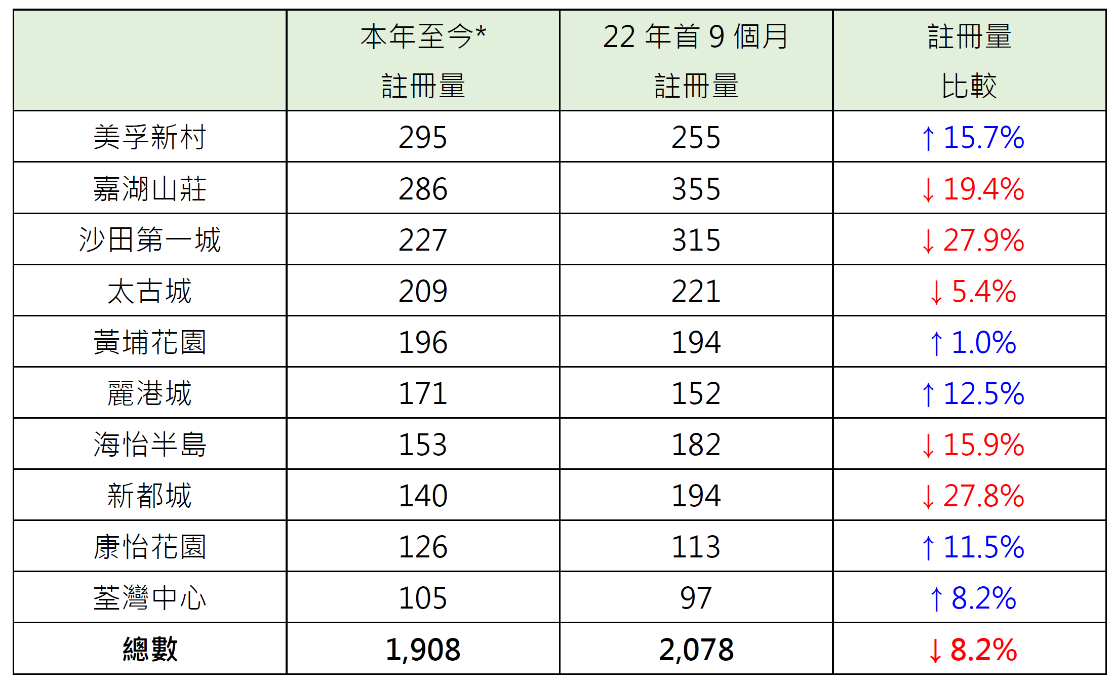 报升屋苑中,美孚新村录295宗注册,较去年首9个月的255宗增加约15.7%;丽港城录171宗注册,较去年首9个月的152宗增加12.5%;康怡花园录126宗注册,较去年首9个月的113宗增加约11.5%。