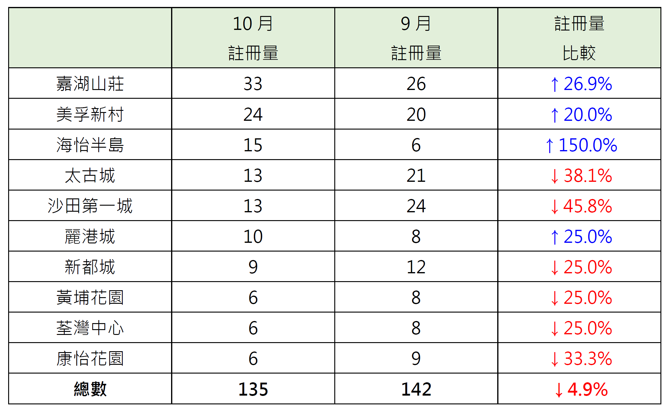 报升屋苑中,海怡半岛录15宗注册,较9月的6宗大增1.5倍;嘉湖山庄录33宗注册,较9月的26宗增加约26.9%;丽港城录10宗注册,较9月的8宗增加25%;美孚新村录24宗注册,较9月的20宗增加20%。