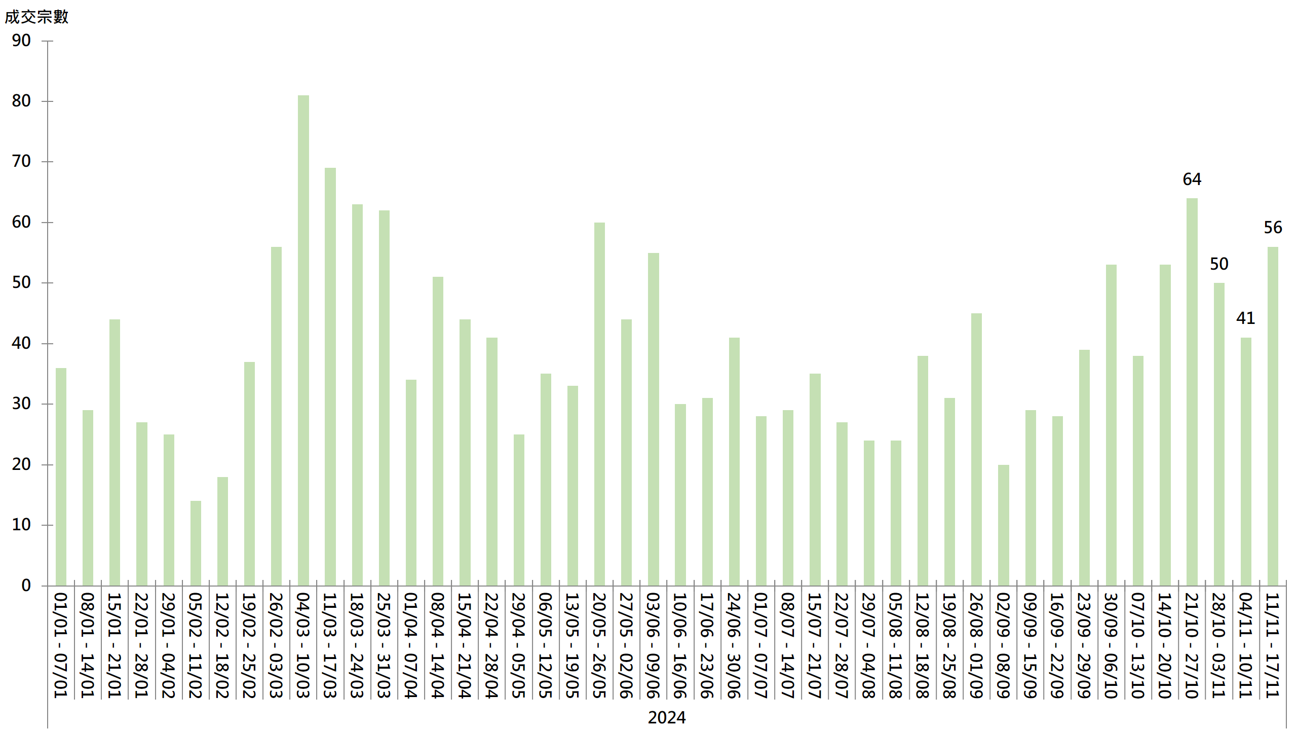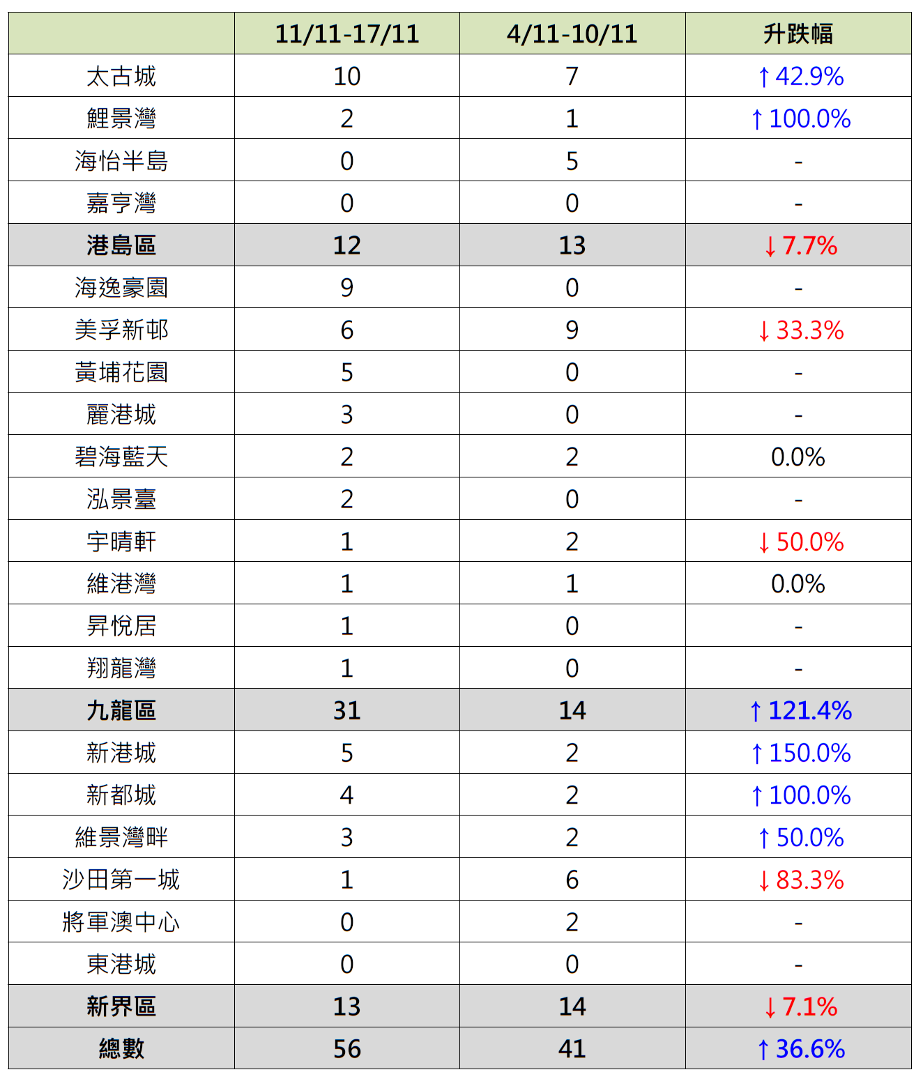 近期未有大型全新盘推售,部分购买力流向二手住宅市场,上周20大屋苑交投表现向好;据本行前线分行所录得的数字显示,综合过去一星期(11月11日至11月17日)全港20大主要屋苑二手买卖录56宗成交,较前周(11月4日至11月10日)的41宗增加约36.6%,创3周新高(见图)。