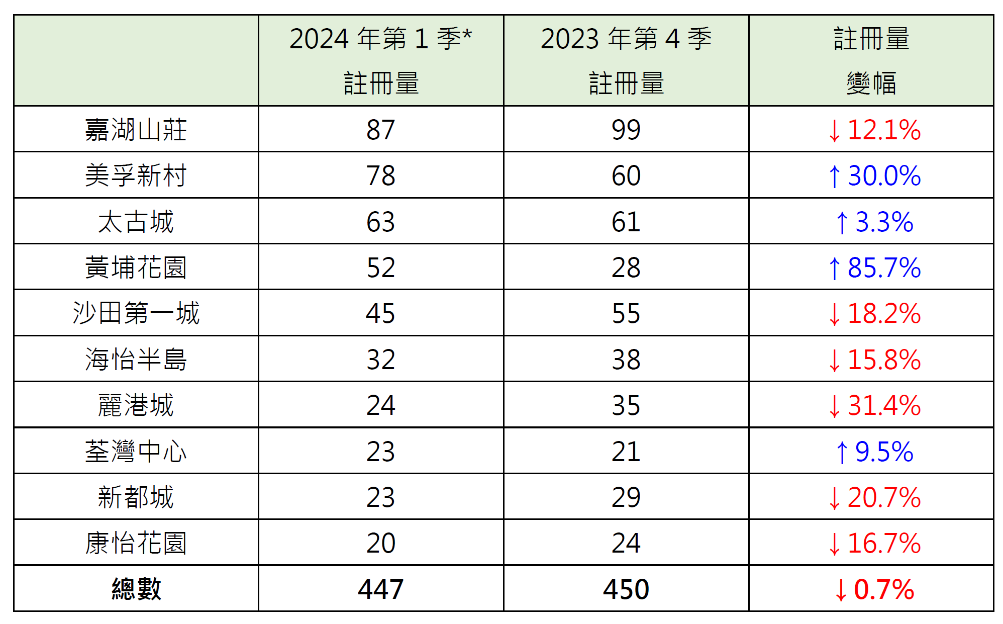 据土地注册处资料显示,十大传统屋苑本季至今(截至3月12日)录447宗注册,已追贴上季全季的450宗(见图);本季全季十大传统屋苑注册量势超越上季水平。