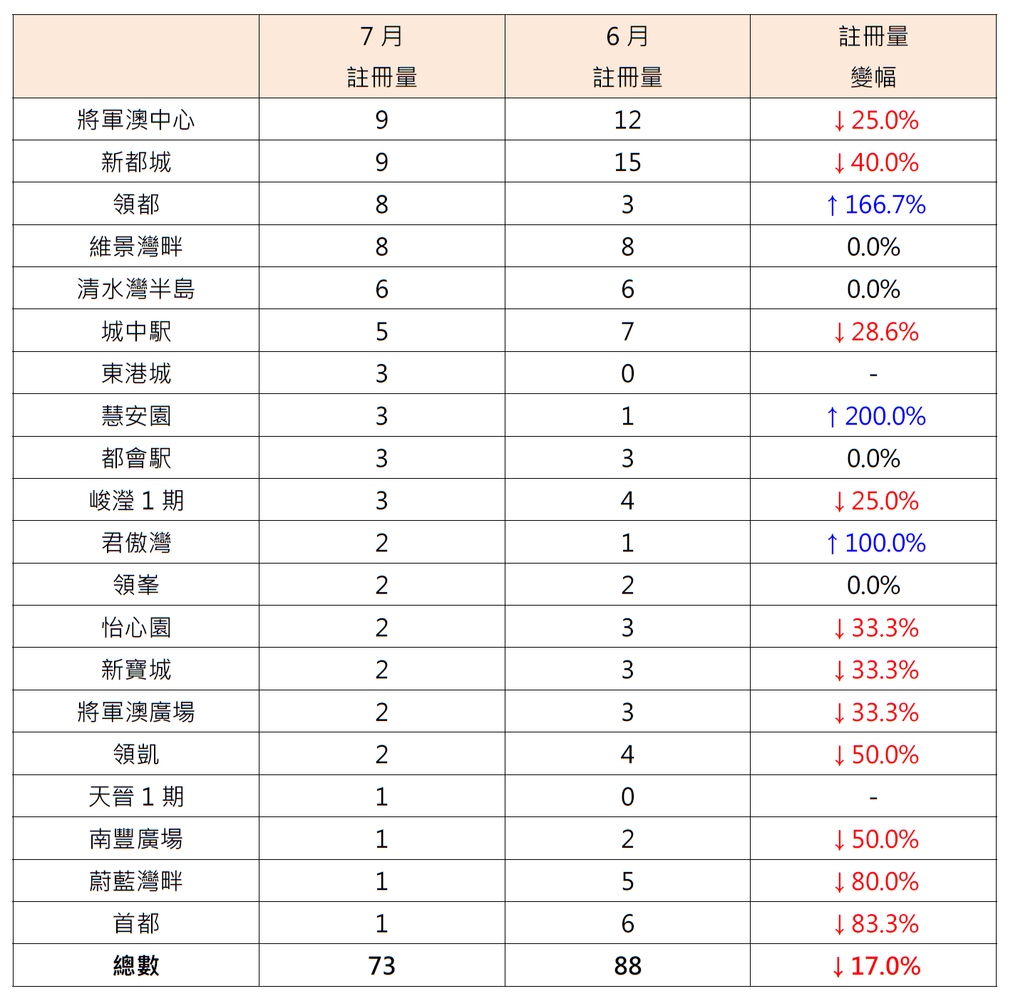 表:7月将军澳区20个私人屋苑二手住宅注册量