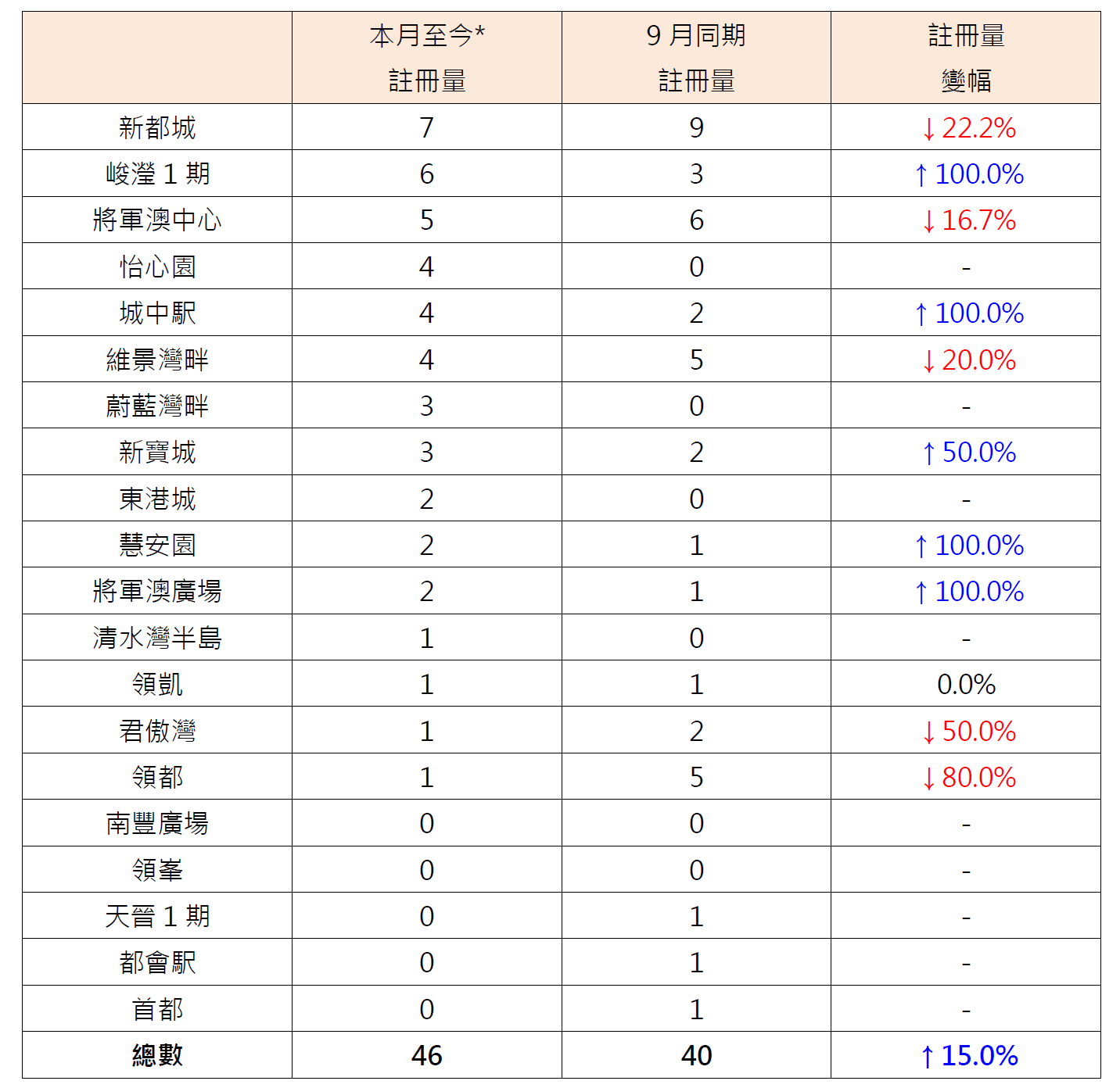 据土地注册处资料显示,本月至今(截至19日)录1,238宗二手住宅注册,较上月同期的1,246宗减少约0.6%,当中将军澳区20个私人屋苑录46宗注册,较上月同期的40宗则增加15%,跑赢大市。鉴于签署买卖合约至递交到土地注册处注册登记需时,10月注册个案一般主要反映9月市况。