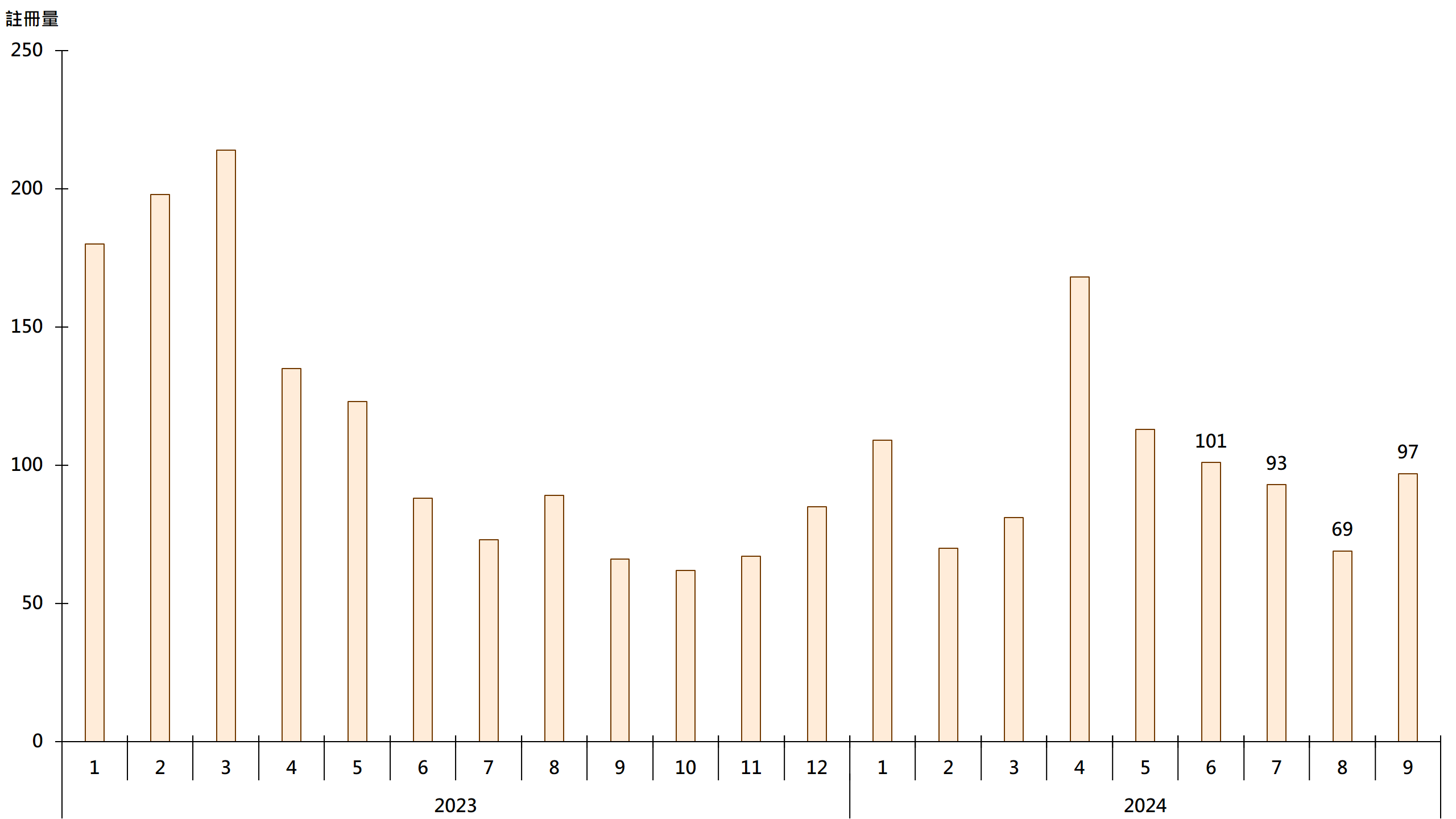 据土地注册处资料显示,9月二手住宅(包括二手私人住宅及二手公营房屋)录2,591宗注册,较8月的2,885宗减少约10.2%;当中将军澳区20个私人屋苑9月录97宗注册,较8月的69宗则增加约40.6%,注册量按月表现胜大市,同时亦创3个月新高(见图)。鉴于签署买卖合约至递交到土地注册处注册登记需时,9月注册个案一般主要反映8月市况。