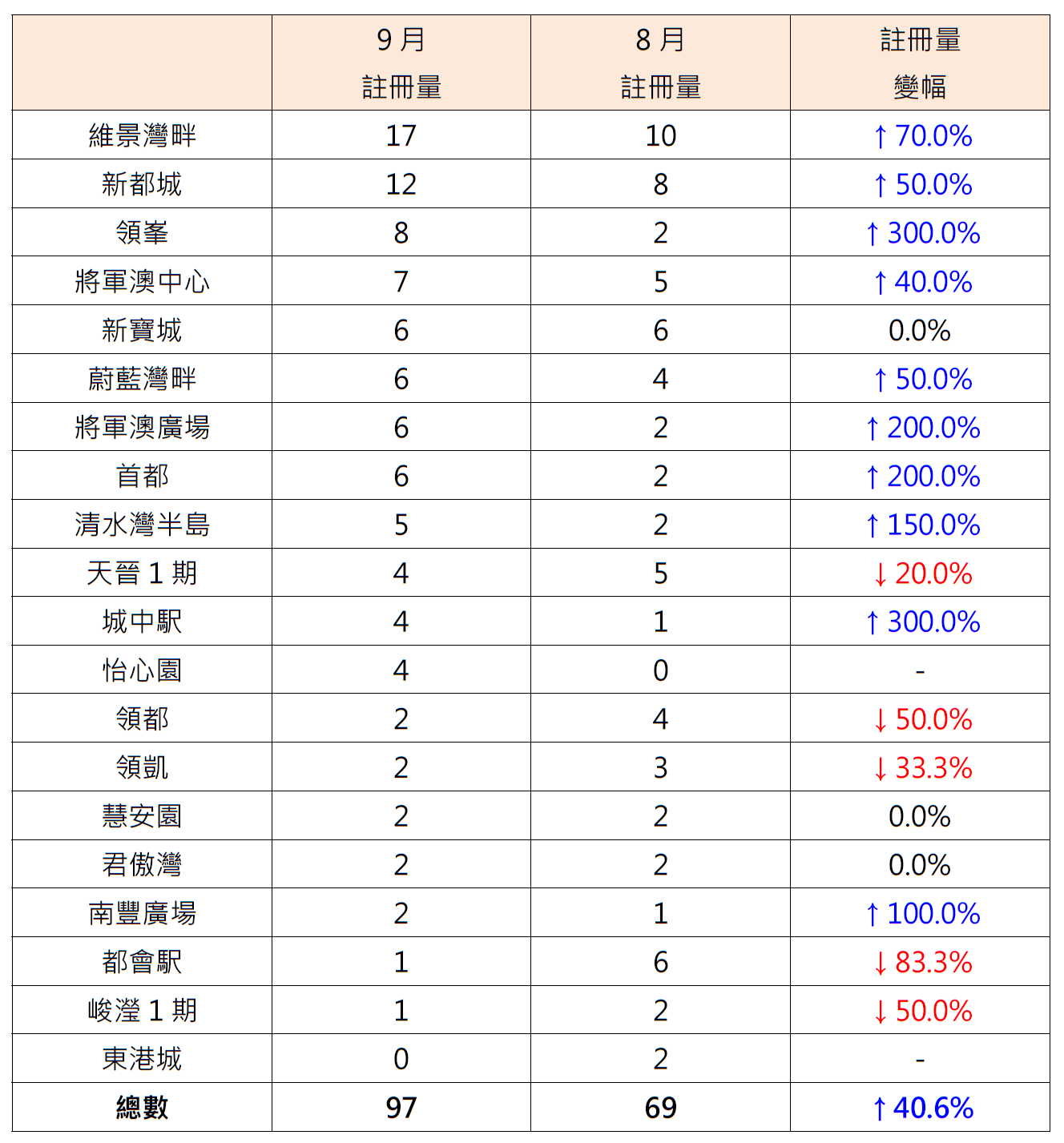 表:9月将军澳区20个私人屋苑二手住宅注册量
